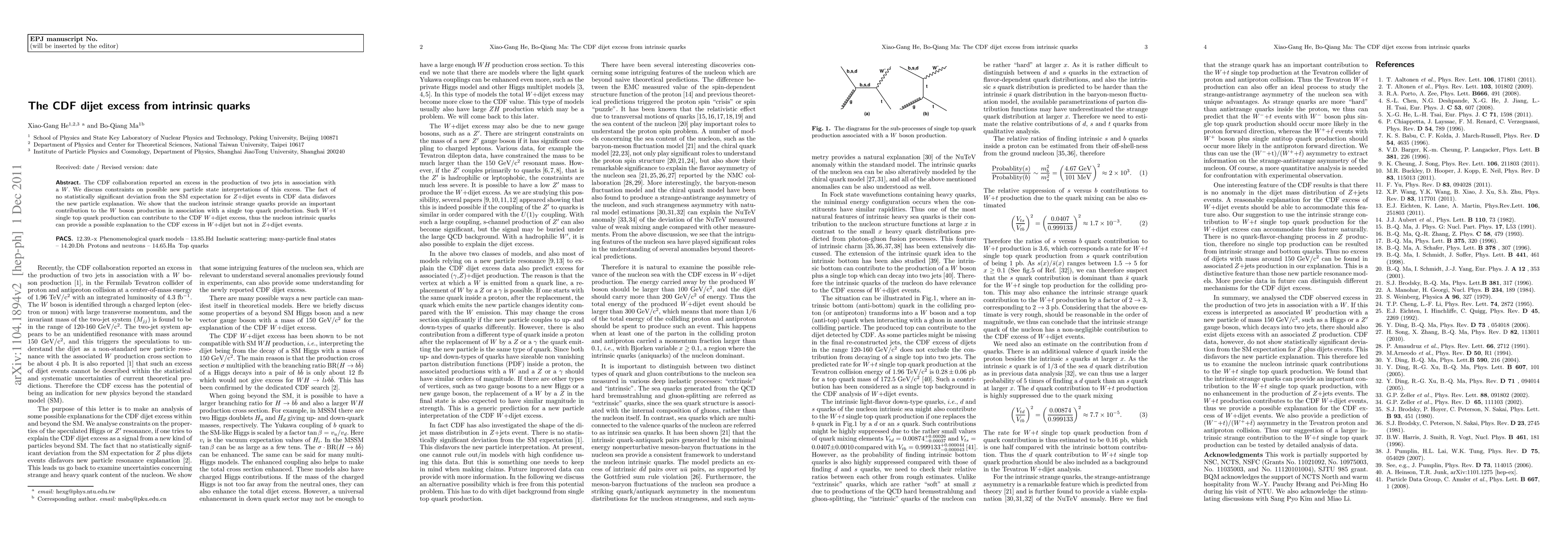 The CDF collaboration reported an excess in the production of two jets in association with a $W$. We discuss constraints on possible new particle state interpretations of this excess. The fact of no statistically significant deviation from the SM expectation for {$Z$+dijet} events in CDF data disfavors the new particle explanation. We show that the nucleon intrinsic strange quarks provide an important contribution to the $W$ boson production in association with a single top quark production. Such {$W$+t} single top quark production can contribute to the CDF {$W$+dijet} excess, thus the nucleon intrinsic quarks can provide a possible explanation to the CDF excess in {$W$+dijet} but not in {$Z$+dijet} events.
