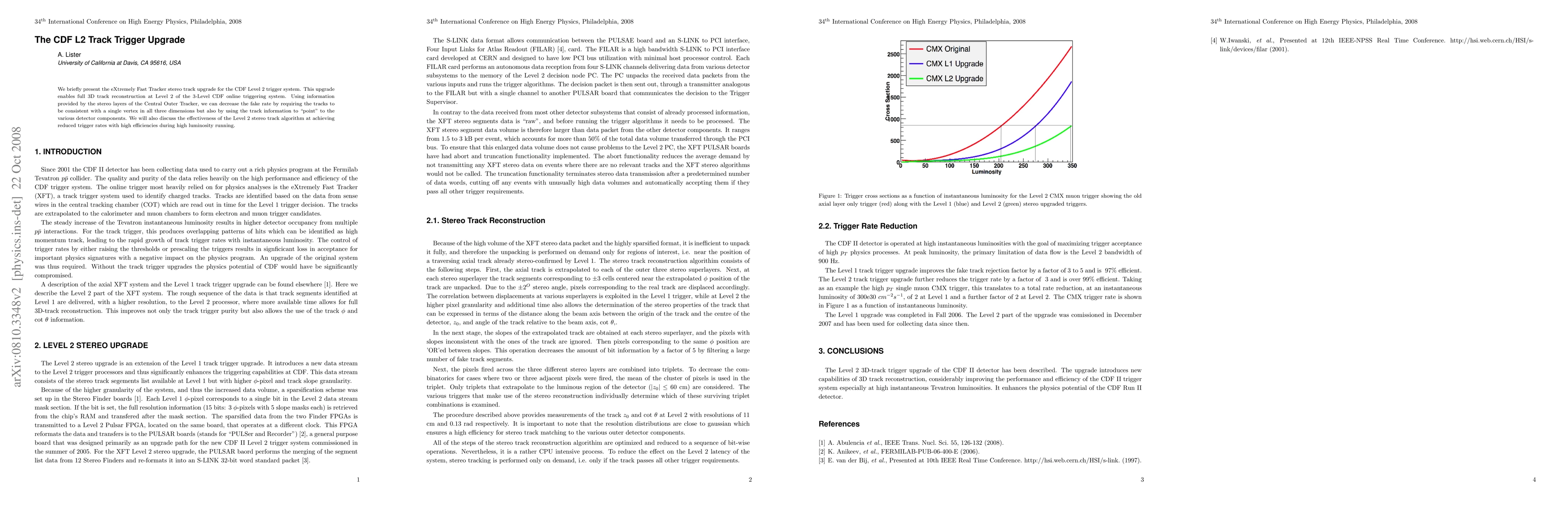 The CDF L2 XFT Trigger Upgrade introduces a stereo track upgrade for the CDF Level 2 trigger system, enabling full 3D track reconstruction and reducing trigger rates by requiring track consistency with a single vertex in all dimensions. The effectiveness of the Level 2 stereo track algorithm in maintaining high efficiency during high luminosity operations is also discussed.