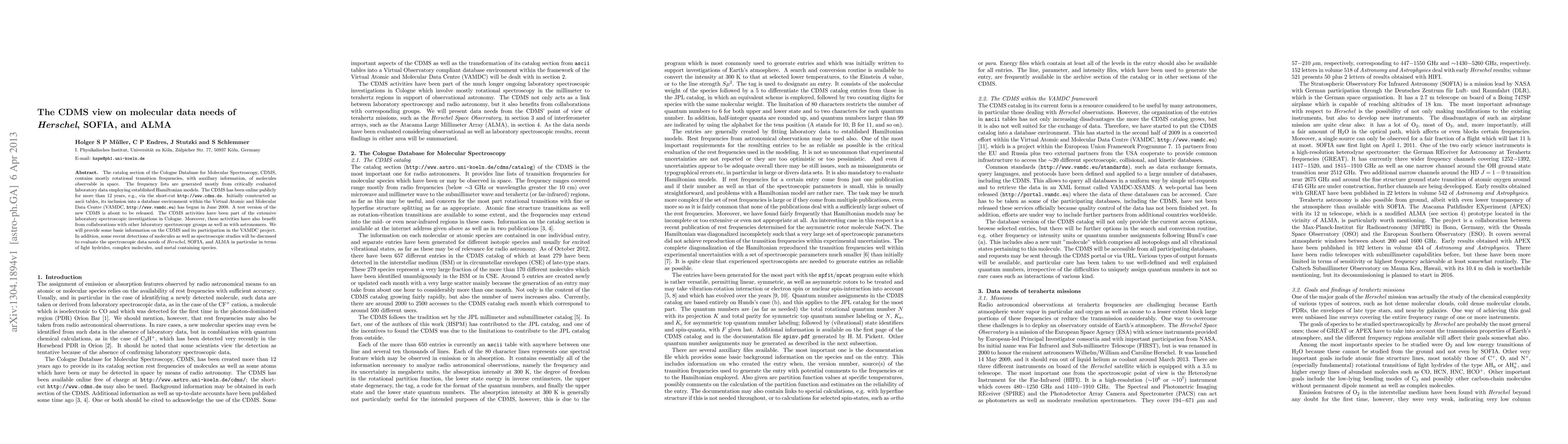 The Cologne Database for Molecular Spectroscopy (CDMS) provides critical rotational transition frequencies and related data for space-observable molecules, primarily from laboratory evaluations. The CDMS, now transitioning to a database format within the VAMDC, supports the spectroscopic data needs of Herschel, SOFIA, and ALMA, particularly for light hydrides, complex molecules, and metal-containing species.