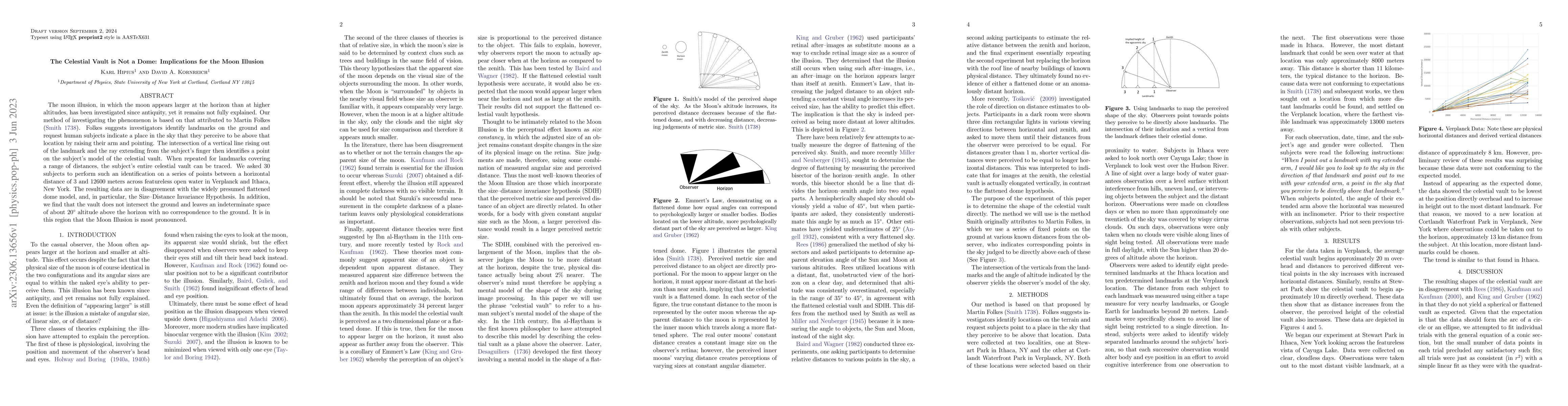 The moon illusion, in which the moon appears larger at the horizon than at higher altitudes, has been investigated since antiquity, yet it remains not fully explained. Our method of investigating the phenomenon is based on that attributed to Martin Folkes. Folkes suggests investigators identify landmarks on the ground and request human subjects indicate a place in the sky that they perceive to be above that location by raising their arm and pointing. The intersection of a vertical line rising out of the landmark and the ray extending from the subject's finger then identifies a point on the subject's model of the celestial vault. When repeated for landmarks covering a range of distances, the subject's entire celestial vault can be traced. We asked 30 subjects to perform such an identification on a series of points between a horizontal distance of 3 and 12600 meters across featureless open water in Verplanck and Ithaca, New York. The resulting data are in disagreement with the widely presumed flattened dome model, and, in particular, the Size-Distance Invariance Hypothesis. In addition, we find that the vault does not intersect the ground and leaves an indeterminate space of about 20 degrees altitude above the horizon with no correspondence to the ground. It is in this region that the Moon Illusion is most pronounced.