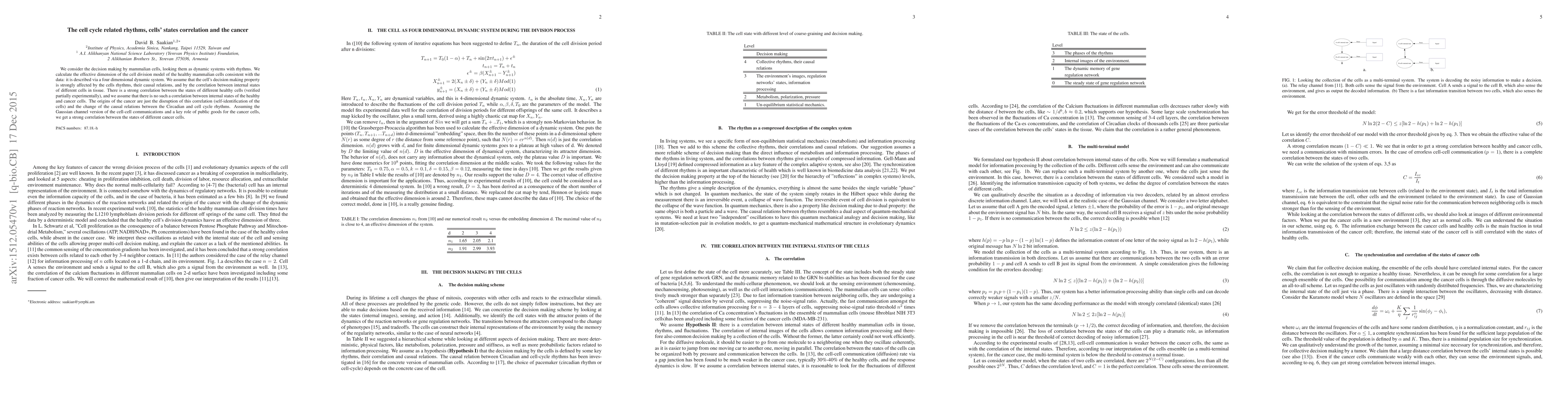 We consider the decision making by mammalian cells, looking them as dynamic systems with rhythms. We calculate the effective dimension of the cell division model of the healthy mammalian cells consistent with the data: it is described via a four dimensional dynamic system. We assume that the cell's decision making property is strongly affected by the cells rhythms, their causal relations, and by the correlation between internal states of different cells in tissue. There is a strong correlation between the states of different healthy cells (verified partially experimentally), and we assume that there is no such a correlation between internal states of the healthy and cancer cells. The origins of the cancer are just the disruption of this correlation (self-identification of the cells) and the change of the causal relations between the Circadian and cell cycle rhythms. Assuming the Gaussian channel version of the cell-cell communications and a key role of public goods for the cancer cells, we get a strong correlation between the states of different cancer cells.