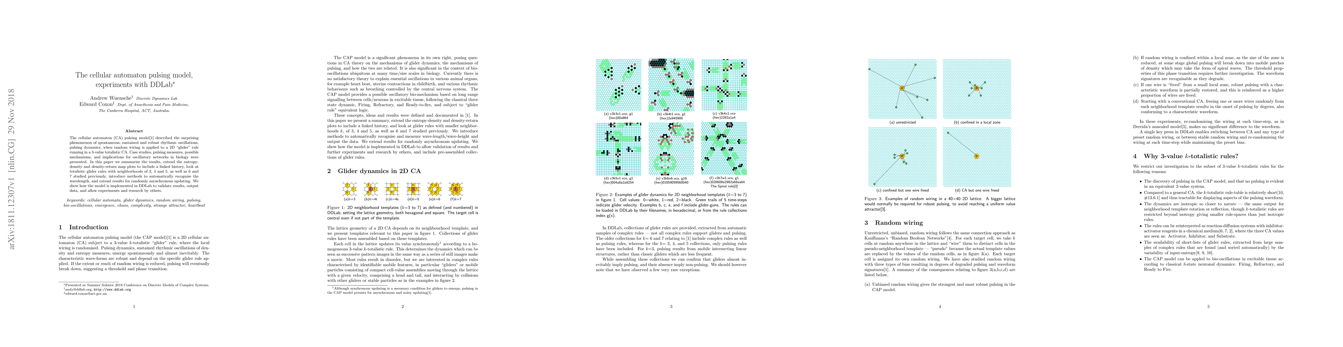 The cellular automaton (CA) pulsing model (arXiv:1806.06416) described the surprising phenomenon of spontaneous, sustained and robust rhythmic oscillations, pulsing dynamics, when random wiring is applied to a 2D `glider' rule running in a 3-value totalistic CA. Case studies, pulsing measures, possible mechanisms, and implications for oscillatory networks in biology were presented. In this paper we summarise the results, extend the entropy-density and density-return map plots to include a linked history, look at totalistic glider rules with neighborhoods of 3, 4 and 5, as well as 6 and 7 studied previously, introduce methods to automatically recognise the wavelength, and extend results for randomly asynchronous updating. We show how the model is implemented in DDLab to validate results, output data, and allow experiments and research by others.