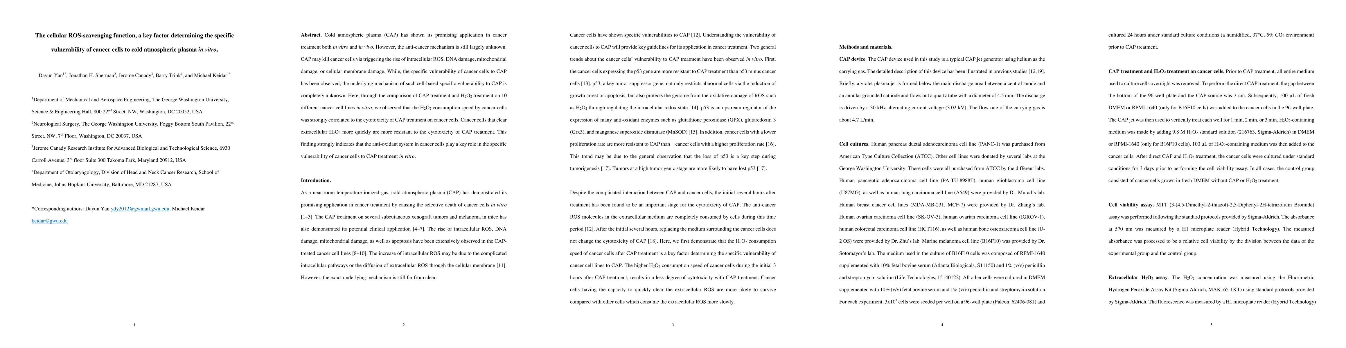 This study reveals that cancer cells' ability to rapidly scavenge H2O2 correlates with their resistance to cold atmospheric plasma (CAP) treatment, suggesting that the cellular ROS-scavenging function is crucial in determining the specific vulnerability of cancer cells to CAP in vitro.