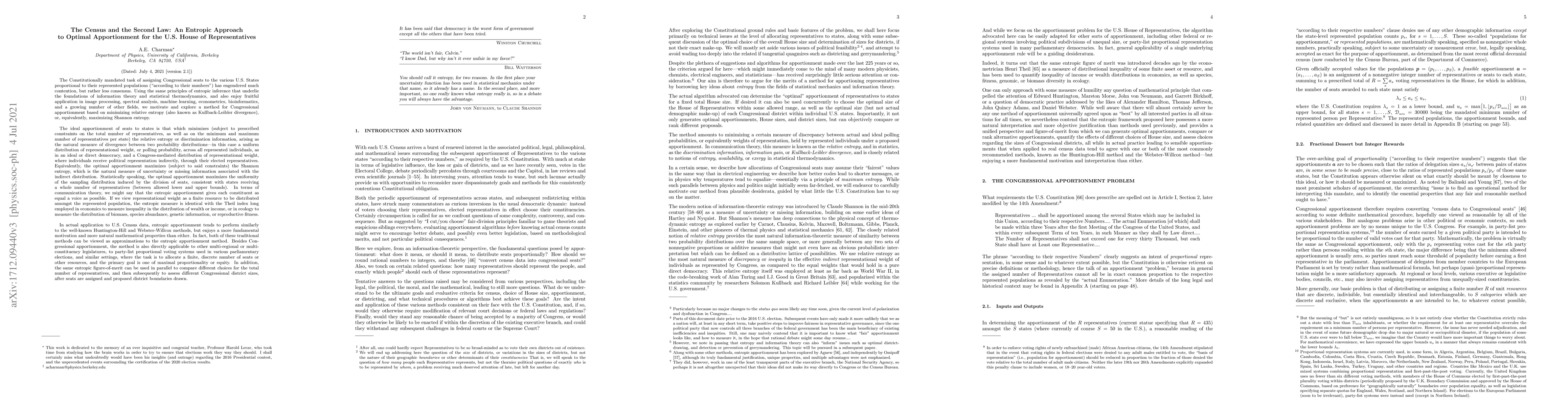 The Constitutionally mandated task of assigning Congressional seats to the various U.S. States proportional to their represented populations ("according to their numbers") has engendered much contention, but rather less consensus. Using the same principles of entropic inference that underlie the foundations of information theory and statistical thermodynamics, and also enjoy fruitful application in image processing, spectral analysis, machine learning, econometrics, bioinformatics, and a growing number of other fields, we motivate and explore a method for Congressional apportionment based on minimizing relative entropy (also known as Kullback-Leibler divergence), or, equivalently, maximizing Shannon entropy. In terms of communication theory, we might say that the entropic apportionment gives each constituent as equal a voice as possible. If we view representational weight as a finite resource to be distributed amongst the represented population, the entropic measure is identical with the Theil index long employed in economics to measure inequality in the distribution of wealth or income, or in ecology to measure the distribution of biomass or reproductive fitness. Besides Congressional apportionment, the method is also directly applicable to other multi-regional or multi-constituency legislatures, to party-list proportional voting systems used in various parliamentary elections, and similar settings, where the task is to allocate a discrete number of seats or other resources, and the primary goal is one of maximal proportionality or equity. In addition, the same entropic figure-of-merit can be used in parallel to compare different choices for the total number of representatives, and then subsequently to assess different Congressional district sizes, after seats are assigned and proposed district boundaries drawn.