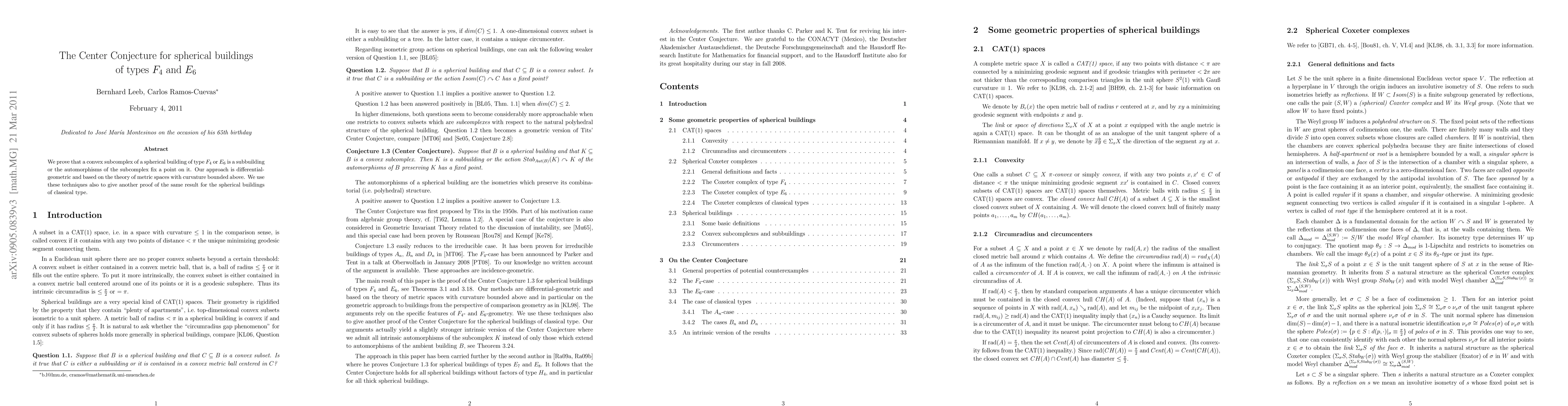 The paper proves the Center Conjecture for spherical buildings of types F4 and E6, showing that any convex subcomplex is either a subbuilding or has a fixed point under automorphisms. The proof employs differential geometry and metric spaces with bounded curvature.