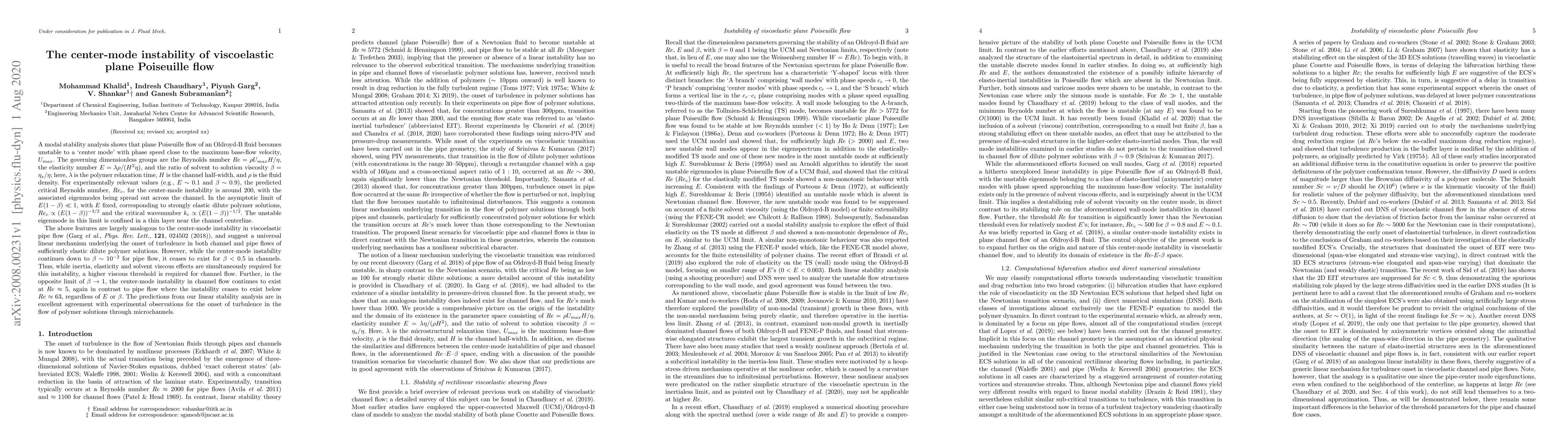 The paper presents a detailed modal stability analysis of viscoelastic plane Poiseuille flow, identifying the center-mode instability and its dependence on dimensionless parameters.