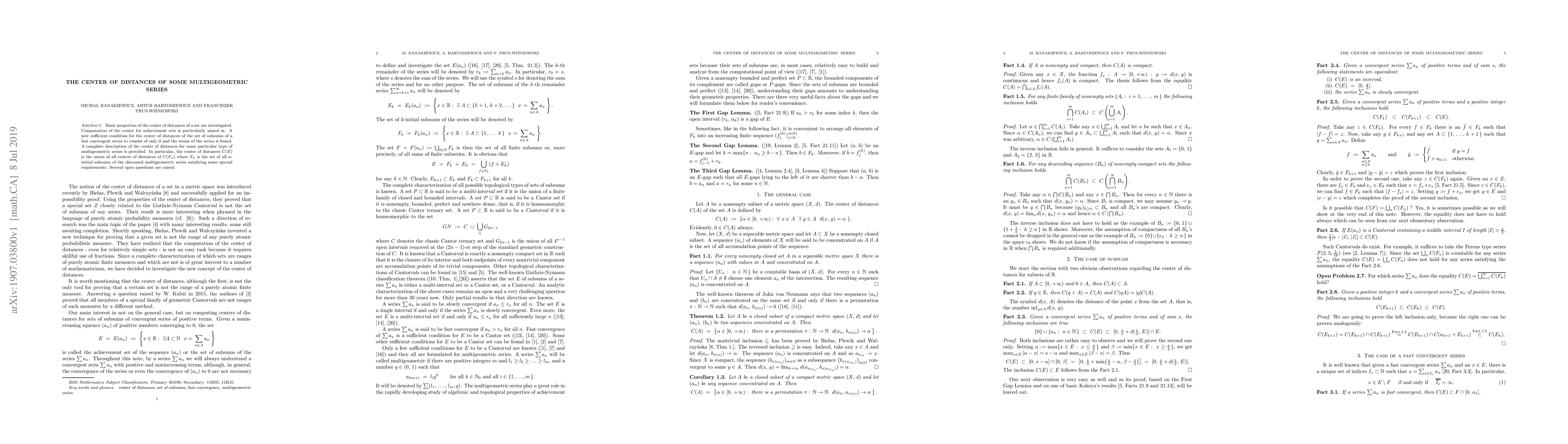 This paper investigates the center of distances for specific multigeometric series, particularly focusing on the achievement sets. It introduces a new sufficient condition for the center of distances of a fast convergent series to include only 0 and the series terms, and provides a complete description for a particular type of multigeometric series.