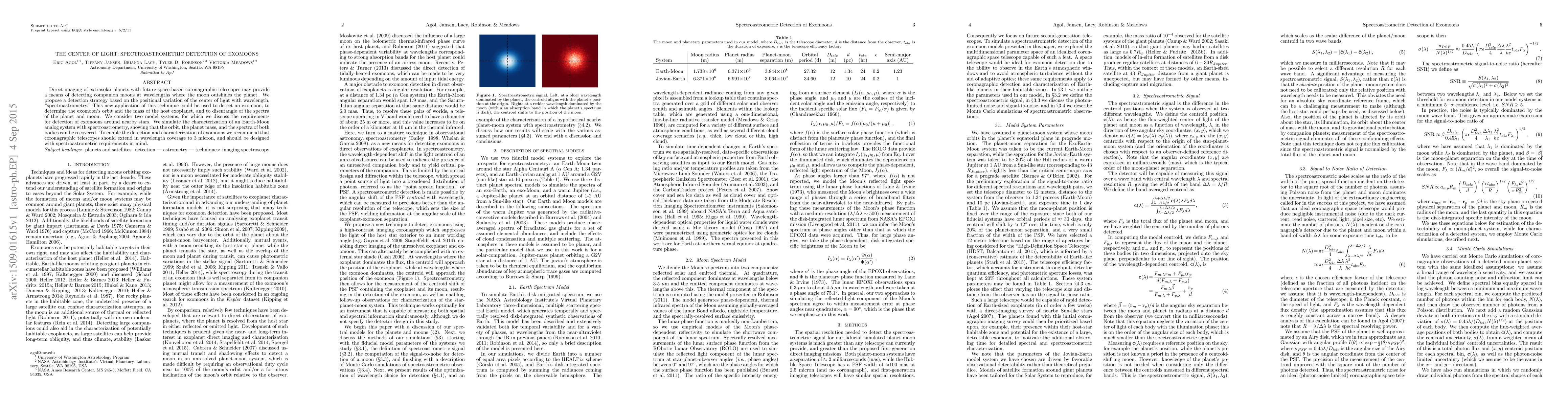 Direct imaging of extrasolar planets with future space-based coronagraphic telescopes may provide a means of detecting companion moons at wavelengths where the moon outshines the planet. We propose a detection strategy based on the positional variation of the center of light with wavelength, "spectroastrometry." This new application of this technique could be used to detect an exomoon, to determine the exomoon's orbit and the mass of the host exoplanet, and to disentangle of the spectra of the planet and moon. We consider two model systems, for which we discuss the requirements for detection of exomoons around nearby stars. We simulate the characterization of an Earth-Moon analog system with spectroastrometry, showing that the orbit, the planet mass, and the spectra of both bodies can be recovered. To enable the detection and characterization of exomoons we recommend that coronagraphic telescopes should extend in wavelength coverage to 3 micron, and should be designed with spectroastrometric requirements in mind.