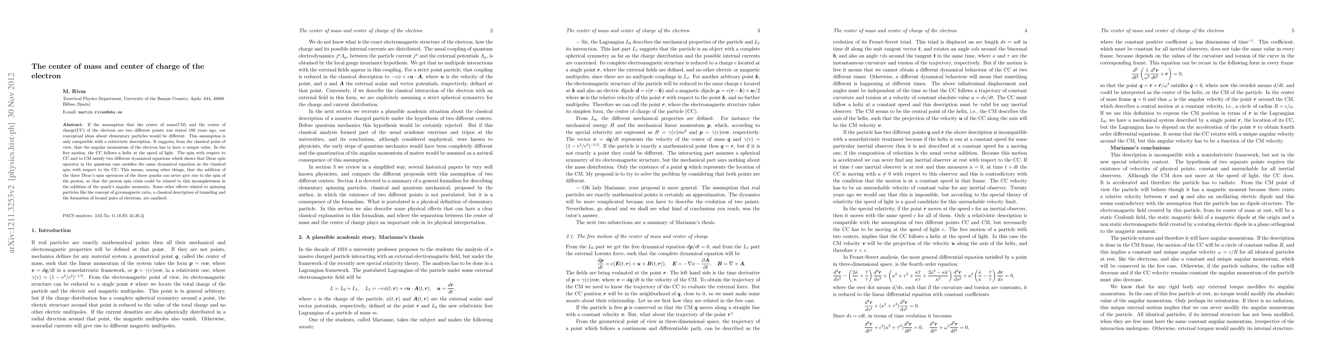 If the assumption that the center of mass(CM) and the center of charge(CC) of the electron are two different points was stated 100 years ago, our conceptual ideas about elementary particles would be different. This assumption is only compatible with a relativistic description. It suggests, from the classical point of view, that the angular momentum of the electron has to have a unique value. In the free motion, the CC follows a helix at the speed of light. The spin with respect to CC and to CM satisfy two different dynamical equations which shows that Dirac spin operator in the quantum case satisfies the same dynamical equation as the classical spin with respect to the CC. This means, among other things, that the addition of the three Dirac's spin operators of the three quarks can never give rise to the spin of the proton, so that the proton spin crisis could be related to this incompleteness in the addition of the quark's angular momenta. Some other effects related to spinning particles like the concept of gyromagnetic ratio, a classical description of tunneling and the formation of bound pairs of electrons, are analized.
