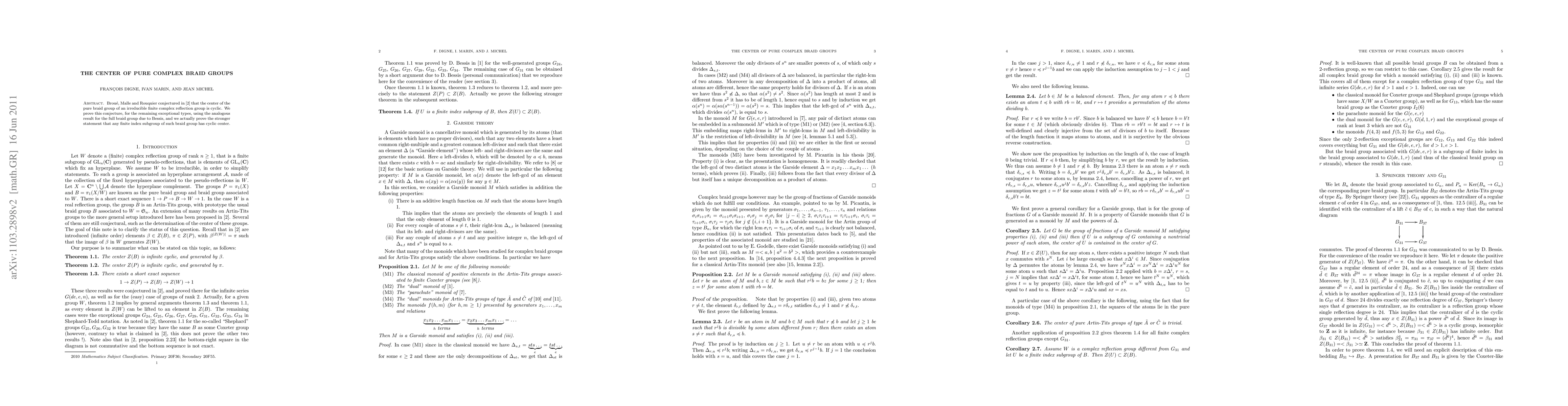 Researchers prove a conjecture about the center of pure complex braid groups for irreducible finite reflection groups, showing that any finite index subgroup has a cyclic center.