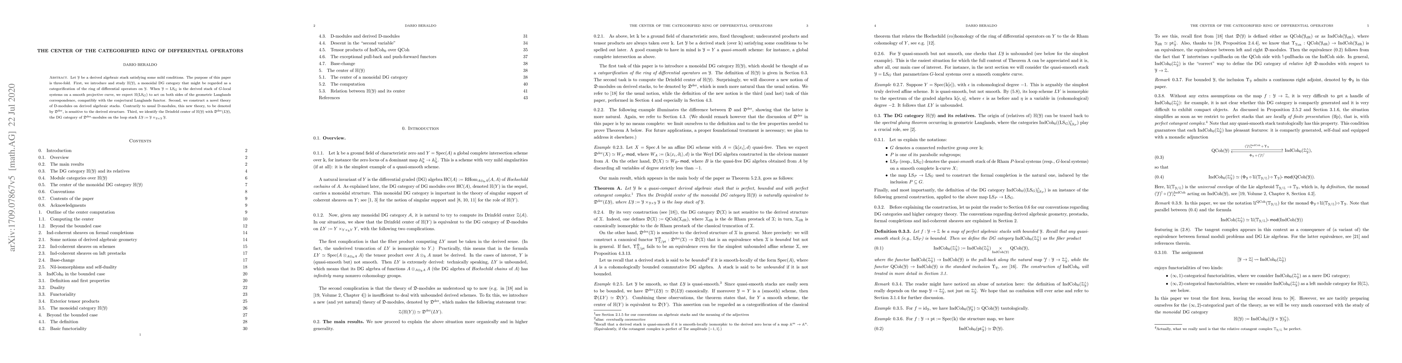 Let \Y be a derived algebraic stack satisfying some mild conditions. The purpose of this paper is three-fold. First, we introduce and study H(\Y), a monoidal DG category that might be regarded as a categorification of the ring of differential operators on \Y. When \Y = \LS_G is the derived stack of G-local systems on a smooth projective curve, we expect H(\LS_G) to act on both sides of the geometric Langlands correspondence, compatibly with the conjectural Langlands functor. Second, we construct a novel theory of D-modules on derived algebraic stacks. Contrarily to usual D-modules, this new theory, to be denoted by D^{der}, is sensitive to the derived structure. Third, we identify the Drinfeld center of H(\Y) with D^{der}(L\Y), the DG category of D^{der}-modules on the loop stack of \Y.