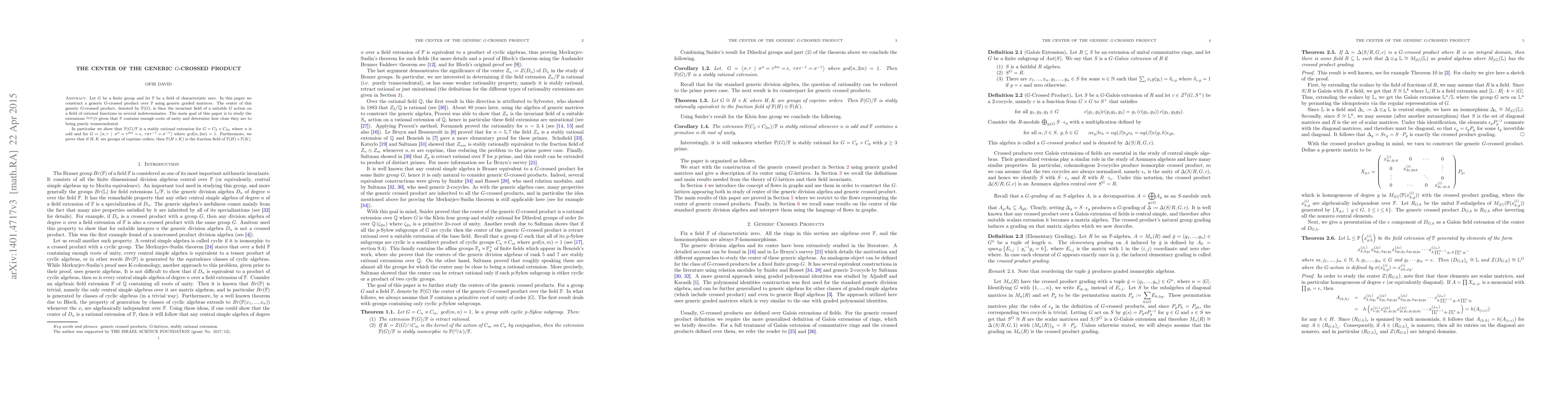 This paper constructs a generic G-crossed product over a field F of characteristic zero and explores its center F(G), which is the invariant field under a G action. It demonstrates that F(G)/F is a stably rational extension for specific group structures and shows that the fraction field of tensor products corresponds to the center of the crossed product for groups of coprime orders.