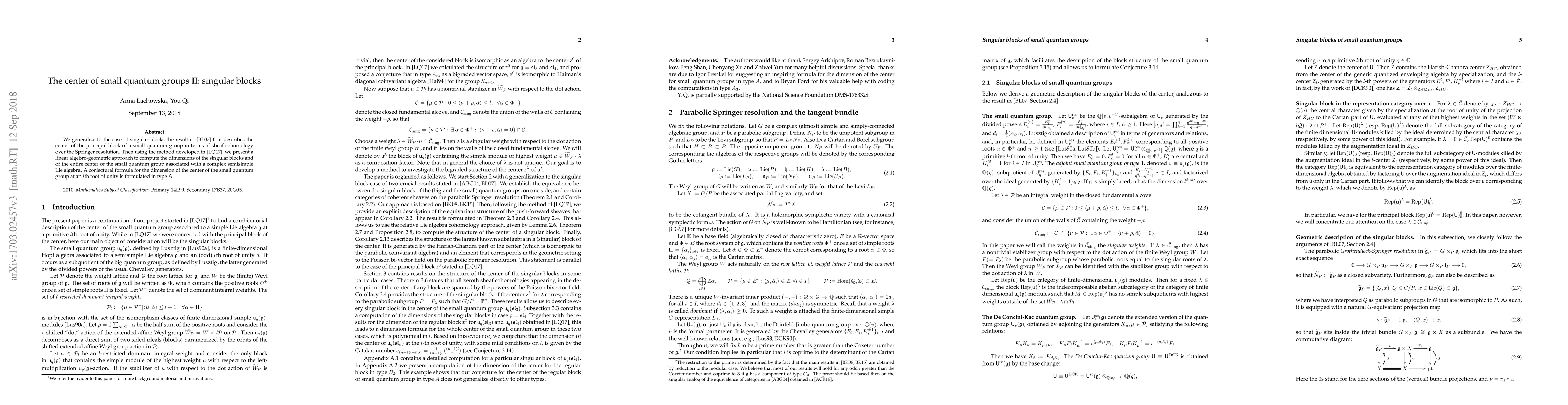 This paper generalizes the center of the principal block of a small quantum group to singular blocks, employing sheaf cohomology over the Springer resolution. It also introduces a linear algebro-geometric method to compute dimensions of singular blocks and the entire center, and proposes a conjecture for the center's dimension in type A.
