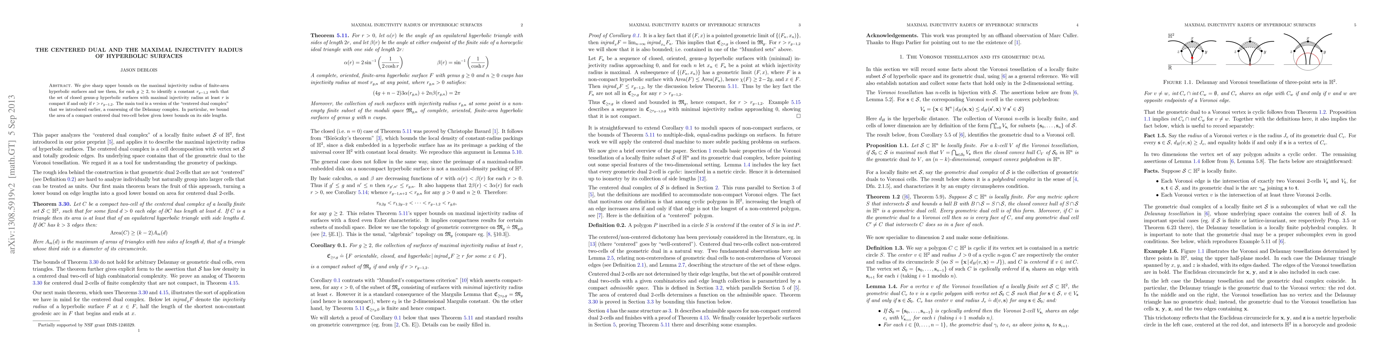 We give sharp upper bounds on the maximal injectivity radius of finite-area hyperbolic surfaces and use them, for each g at least 2, to identify a constant r_{g-1,2} with the property that the set of closed genus-g hyperbolic surfaces with maximal injectivity radius at least r is compact if and only if r > r_{g-1,2}. The main tool is a version of the "centered dual complex" that we introduced earlier, a coarsening of the Delaunay complex of a locally finite set. In particular, we bound the area of a compact centered dual two-cell below given lower bounds on its side lengths.