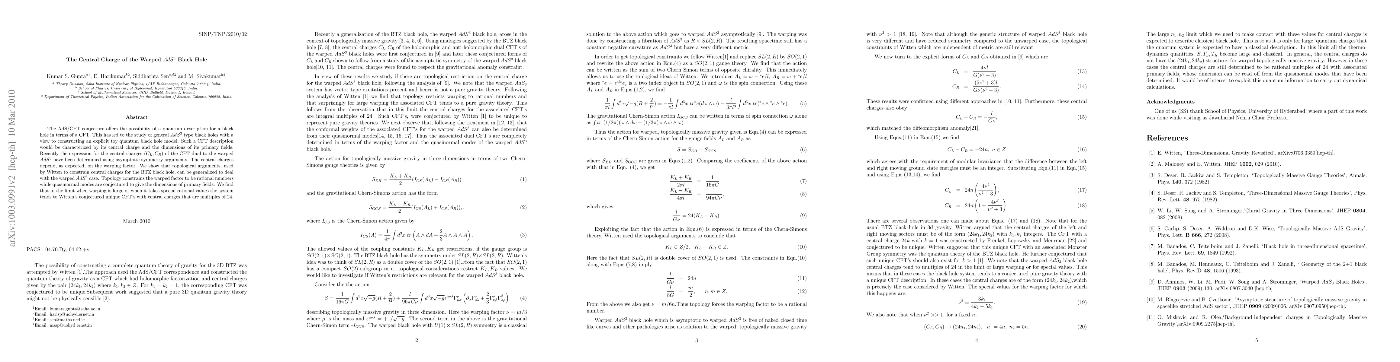 The AdS/CFT conjecture offers the possibility of a quantum description for a black hole in terms of a CFT. This has led to the study of general AdS^3 type black holes with a view to constructing an explicit toy quantum black hole model. Such a CFT description would be characterized by its central charge and the dimensions of its primary fields. Recently the expression for the central charges (C_L, C_R) of the CFT dual to the warped AdS^3 have been determined using asymptotic symmetry arguments. The central charges depend, as expected, on the warping factor. We show that topological arguments, used by Witten to constrain central charges for the BTZ black hole, can be generalized to deal with the warped AdS^3 case. Topology constrains the warped factor to be rational numbers while quasinormal modes are conjectured to give the dimensions of primary fields. We find that in the limit when warping is large or when it takes special rational values the system tends to Witten's conjectured unique CFT's with central charges that are multiples of 24.