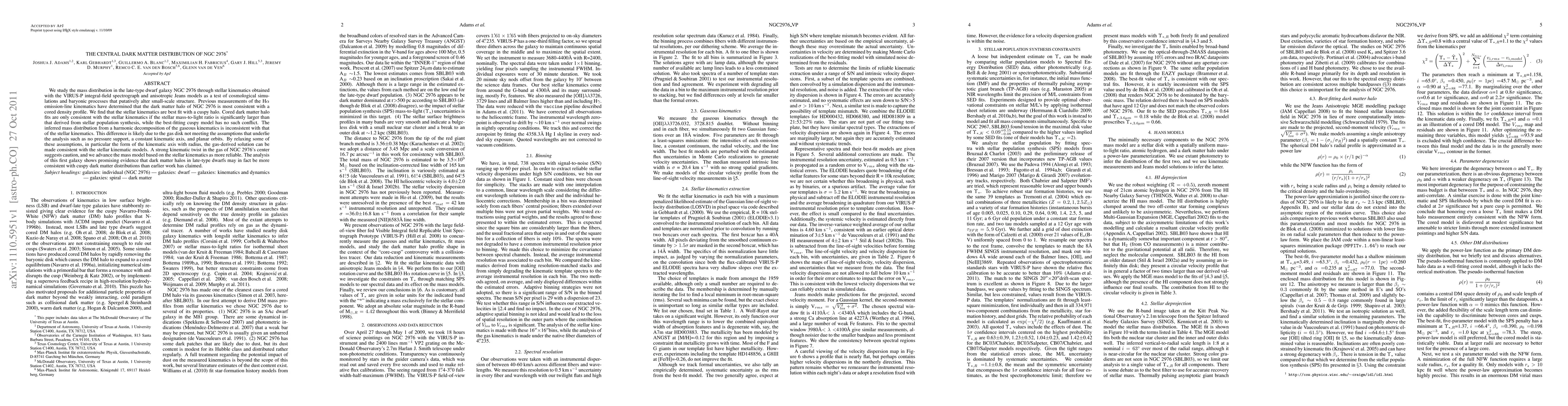 This study investigates the dark matter distribution in NGC 2976 using stellar kinematics and anisotropic Jeans models, finding that the galaxy's dark matter halo is best described as cuspy rather than cored. The analysis suggests that gas kinematics are inconsistent with stellar data due to non-planar orbits and pressure support, indicating a more reliable mass model based on stellar kinematics.