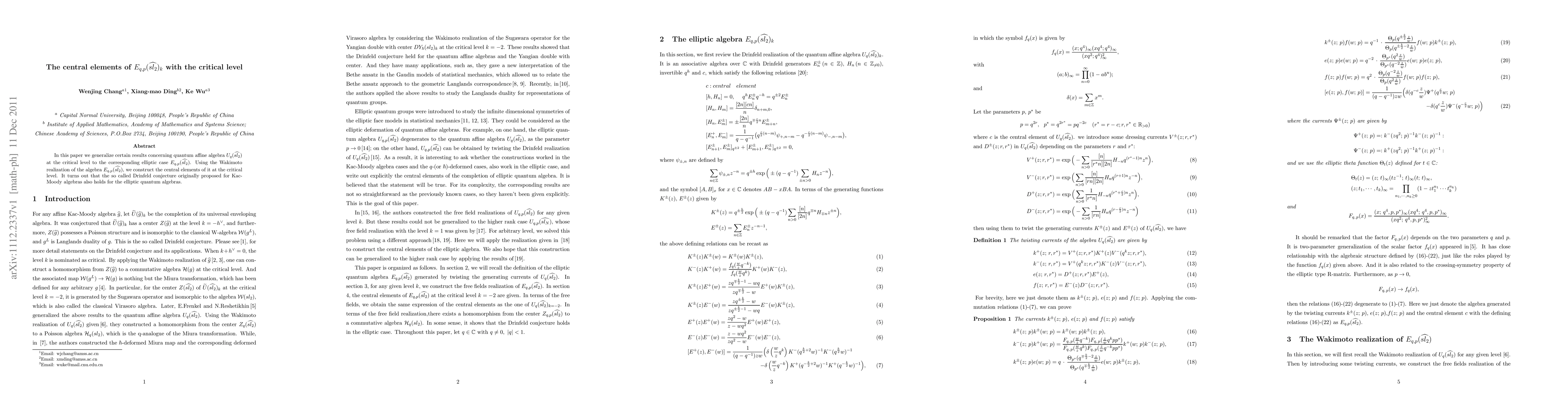 In this paper we generalize certain results concerning quantum affine algebra $U_{q}(\hat{sl_{2}})$ at the critical level to the corresponding elliptic case $E_{q,p}(\hat{sl_2})$. Using the Wakimoto realization of the algebra $E_{q,p}(\hat{sl_2})$, we construct the central elements of it at the critical level. It turns out that the so called Drinfeld conjecture originally proposed for Kac-Moody algebras also holds for the elliptic quantum algebras.