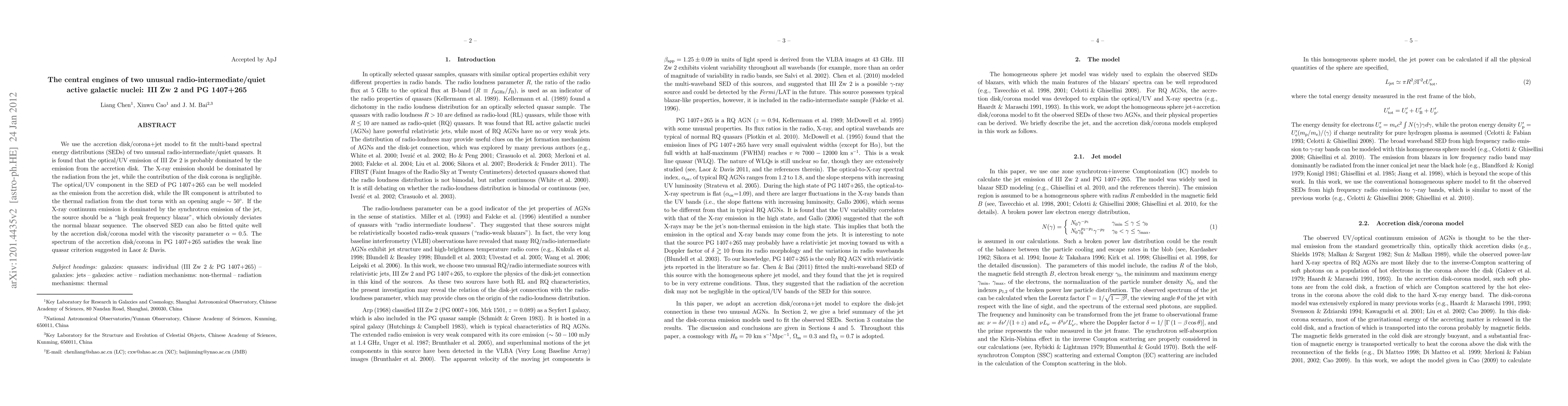 We use the accretion disk/corona+jet model to fit the multi-band spectral energy distributions (SEDs) of two unusual radio-intermediate/quiet quasars. It is found that the optical/UV emission of III Zw 2 is probably dominated by the emission from the accretion disk. The X-ray emission should be dominated by the radiation from the jet, while the contribution of the disk corona is negligible. The optical/UV component in the SED of PG 1407+265 can be well modeled as the emission from the accretion disk, while the IR component is attributed to the thermal radiation from the dust torus with an opening angle ~ 50\circ. If the X-ray continuum emission is dominated by the synchrotron emission of the jet, the source should be a "high peak frequency blazar", which obviously deviates the normal blazar sequence. The observed SED can also be fitted quite well by the accretion disk/corona model with the viscosity parameter ? = 0:5. The spectrum of the accretion disk/corona in PG 1407+265 satisfies the weak line quasar criterion suggested in Laor & Davis.