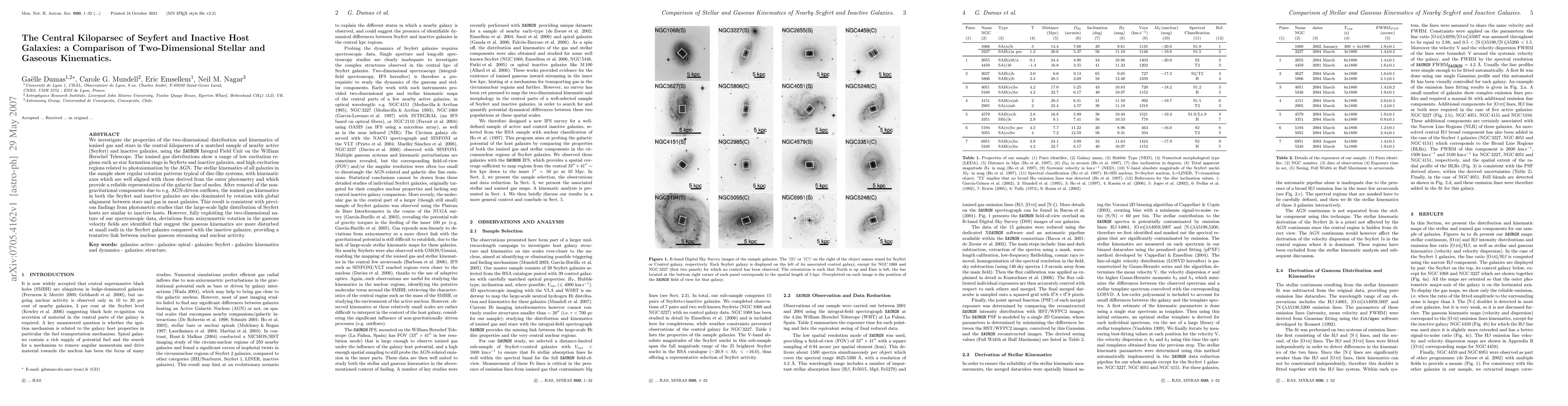 This study compares the two-dimensional kinematics of stars and ionised gas in the central kiloparsecs of Seyfert and inactive galaxies, revealing that both show regular rotation patterns. While the gas kinematics in Seyfert galaxies exhibit more disturbed, non-axisymmetric features compared to inactive galaxies, suggesting a link between nuclear activity and gaseous dynamics.