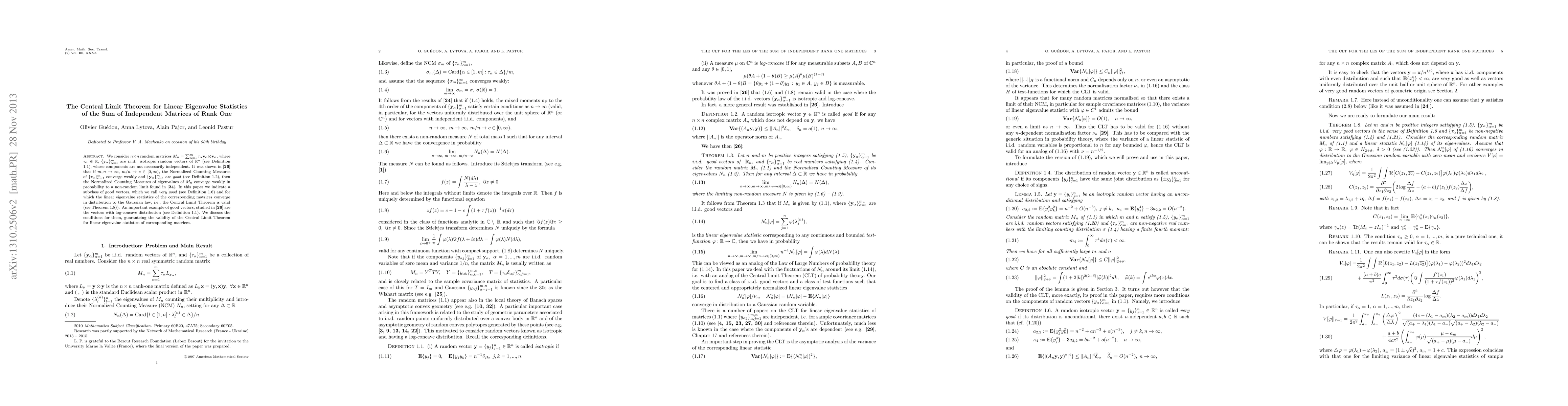 This paper investigates the Central Limit Theorem for linear eigenvalue statistics of $n\times n$ random matrices formed by the sum of independent rank-one matrices. It identifies a subclass of "very good" vectors, showing that their eigenvalue statistics converge to the Gaussian law under certain conditions.