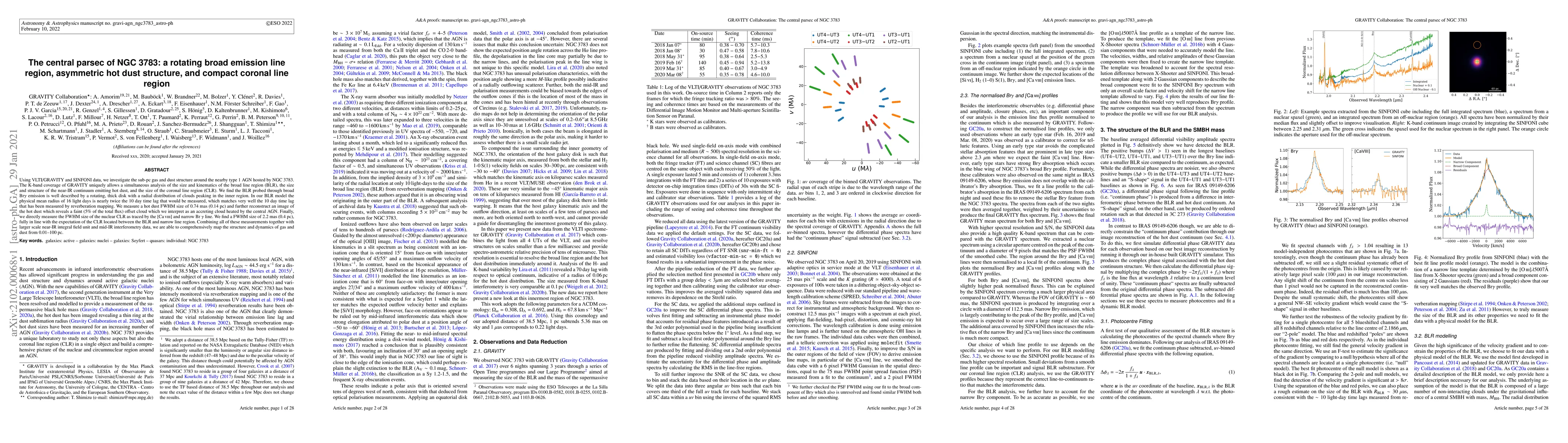 Using VLTI/GRAVITY and SINFONI data, we investigate the sub-pc gas and dust structure around the nearby type 1 AGN hosted by NGC 3783. The K-band coverage of GRAVITY uniquely allows a simultaneous analysis of the size and kinematics of the broad line region (BLR), the size and structure of the near-IR continuum emitting hot dust, and the size of the coronal line region (CLR). We find the BLR probed through broad Br$\gamma$ emission is well described by a rotating, thick disk with a radial distribution of clouds peaking in the inner region. In our BLR model the physical mean radius of 16 light days is nearly twice the 10 day time lag that would be measured, which matches very well the 10 day time lag that has been measured by reverberation mapping. We measure a hot dust FWHM size of 0.74 mas (0.14 pc) and further reconstruct an image of the hot dust which reveals a faint (5% of the total flux) offset cloud which we interpret as an accreting cloud heated by the central AGN. Finally, we directly measure the FWHM size of the nuclear CLR as traced by the [CaVIII] and narrow Br$\gamma$ line. We find a FWHM size of 2.2 mas (0.4 pc), fully in line with the expectation of the CLR located between the BLR and narrow line region. Combining all of these measurements together with larger scale near-IR integral field unit and mid-IR interferometry data, we are able to comprehensively map the structure and dynamics of gas and dust from 0.01--100 pc.