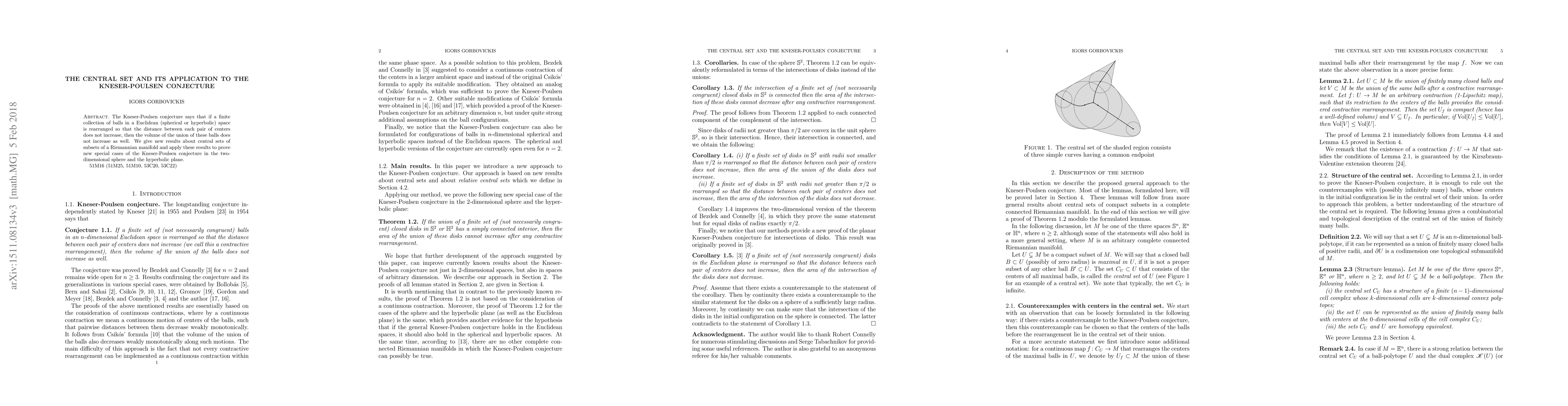 This paper presents new findings on central sets of subsets in Riemannian manifolds, applying them to prove specific cases of the Kneser-Poulsen conjecture in 2D sphere and hyperbolic plane. The conjecture suggests that rearranging non-increasing-distance balls doesn't increase volume, and the research offers fresh insights into this problem.