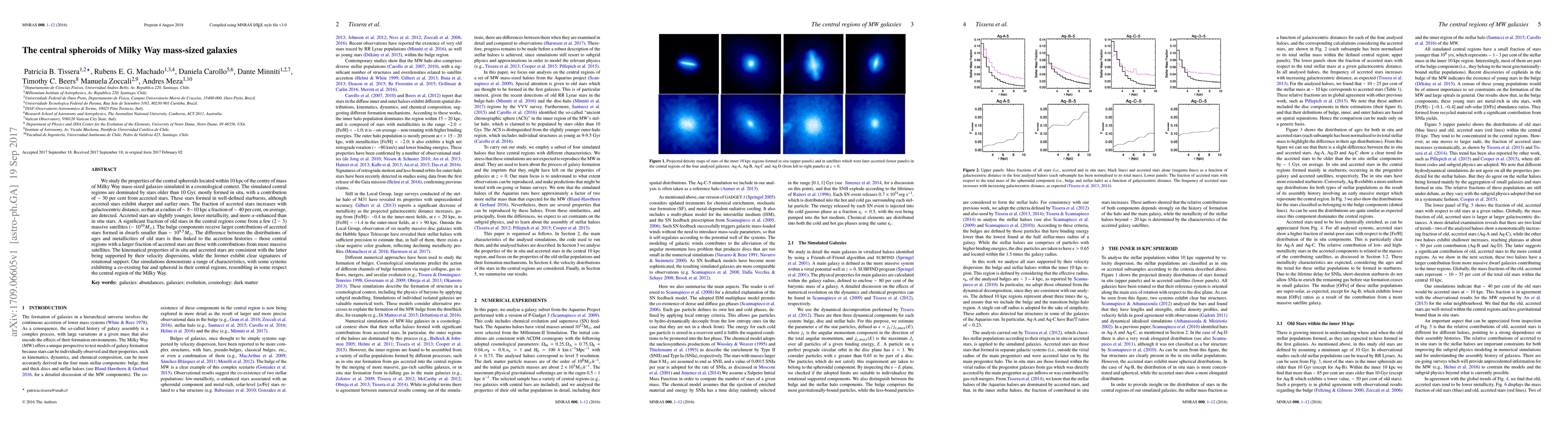 We study the properties of the central spheroids located within 10 kpc of the centre of mass of Milky Way mass-sized galaxies simulated in a cosmological context. The simulated central regions are dominated by stars older than 10 Gyr, mostly formed in situ, with a contribution of ~30 per cent from accreted stars. These stars formed in well-defined starbursts, although accreted stars exhibit sharper and earlier ones. The fraction of accreted stars increases with galactocentric distance, so that at a radius of ~8-10 kpc a fraction of ~40 per cent, on average, are detected. Accreted stars are slightly younger, lower metallicity, and more $\alpha$-enhanced than in situ stars. A significant fraction of old stars in the central regions come from a few ($2-3$) massive satellites ($\sim 10^{10}{\rm M}_\odot$). The bulge components receive larger contributions of accreted stars formed in dwarfs smaller than $\sim 10^{9.5}{\rm M}_\odot$. The difference between the distributions of ages and metallicities of old stars is thus linked to the accretion histories -- those central regions with a larger fraction of accreted stars are those with contributions from more massive satellites. The kinematical properties of in situ and accreted stars are consistent with the latter being supported by their velocity dispersions, while the former exhibit clear signatures of rotational support. Our simulations demonstrate a range of characteristics, with some systems exhibiting a co-existing bar and spheroid in their central regions, resembling in some respect the central region of the Milky Way.