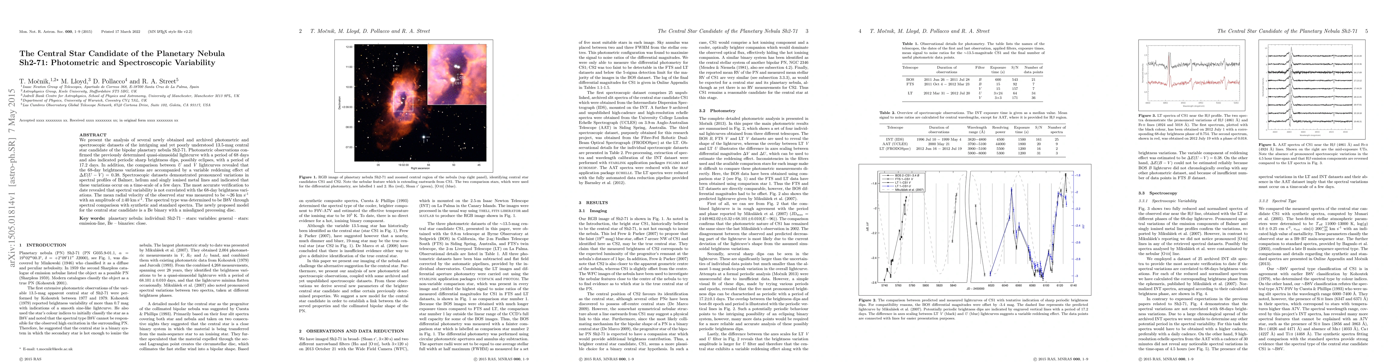 The research paper analyzes photometric and spectroscopic data of a central star candidate in planetary nebula Sh2-71, revealing quasi-sinusoidal lightcurve with periodic eclipses and variable reddening, as well as spectral variability on a few-day time-scale.