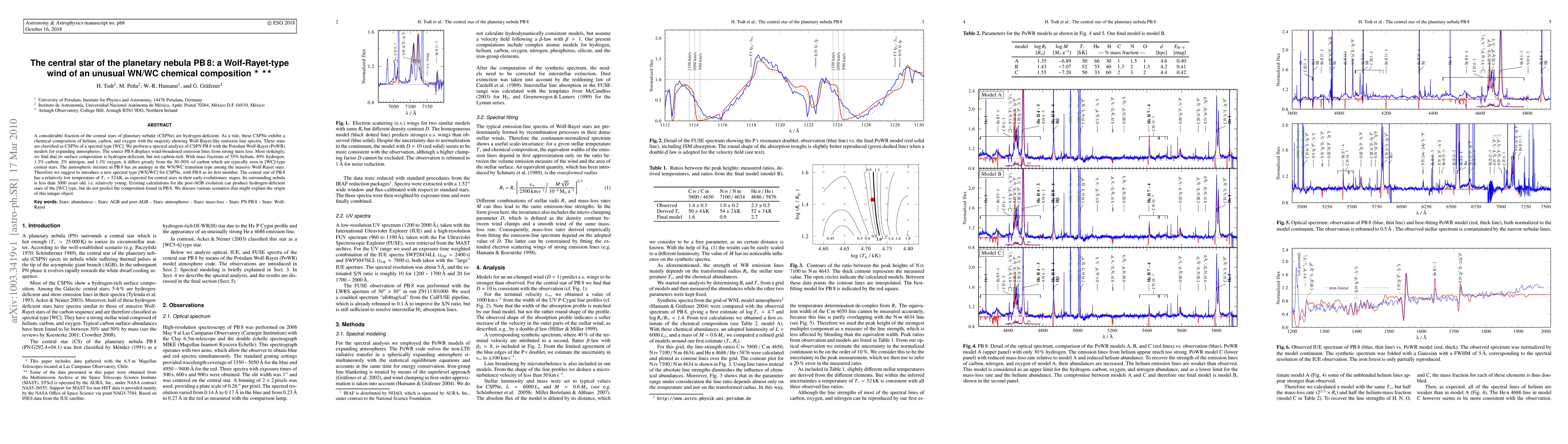 The central star of the planetary nebula PB 8 exhibits a Wolf-Rayet-type wind with an unusual WN/WC chemical composition, differing significantly from typical [WC] stars by having a high helium content and low carbon levels. This suggests a new spectral type [WN/WC] for such hydrogen-deficient, carbon-poor central stars.