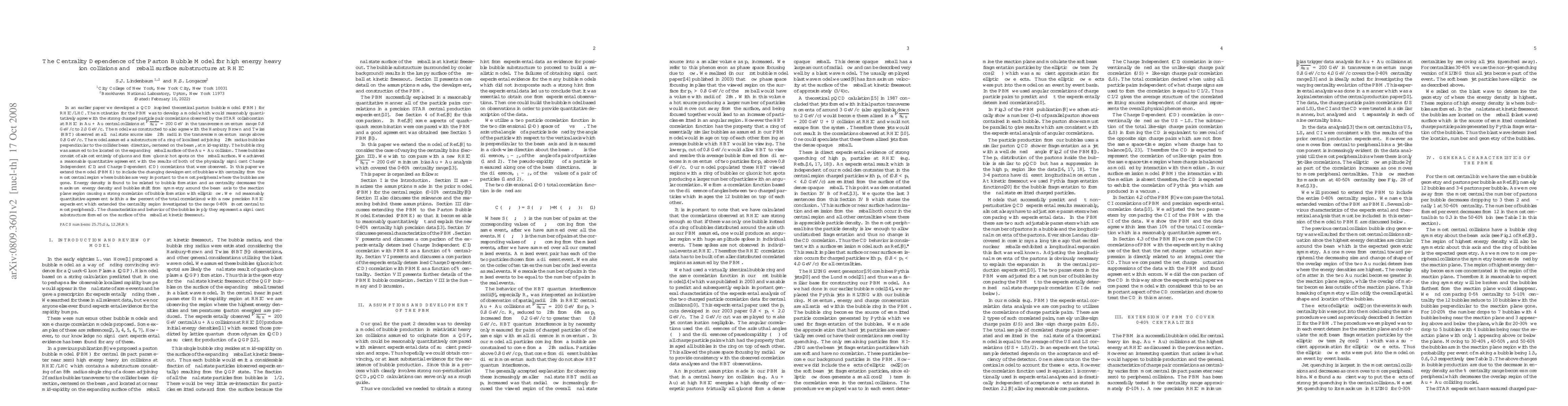 In an earlier paper we developed a QCD inspired theoretical parton bubble model (PBM) for RHIC/LHC. The PBM quantitatively agreed with the strong charged particle pair correlations observed by the STAR collaboration at RHIC in the highest energy Au + Au central collisions, and also agreed with the Hanbury Brown and Twiss (HBT) observed small final state source size approximately 2f radii in the transverse momentum range above 0.8 GeV/c. The model assumed a substructure of a ring of localized adjoining 2f radius bubbles(gluonic hot spots) perpendicular to the collider beam direction, centered on the beam, at mid-rapidity and located on the expanding fireball surface of the Au + Au collisions. In this paper we extend the model (PBME) to include the changing development of bubbles with centrality from the most central region where bubbles are very important to the most peripheral where the bubbles are gone. Energy density is found to be related to bubble formation and as centrality decreases the maximum energy density and bubbles shift from symmetry around the beam axis to the reaction plane region causing a strong correlation of bubble formation with elliptic flow. We obtained reasonably quantitative agreement (within a few percent of the total correlations) with a new precision RHIC experiment which extended the centrality region investigated to the range 0-80% (most central to most peripheral). The characteristics and behavior of the bubbles imply they represent a significant substructure formed on the surface of the fireball at kinetic freezeout