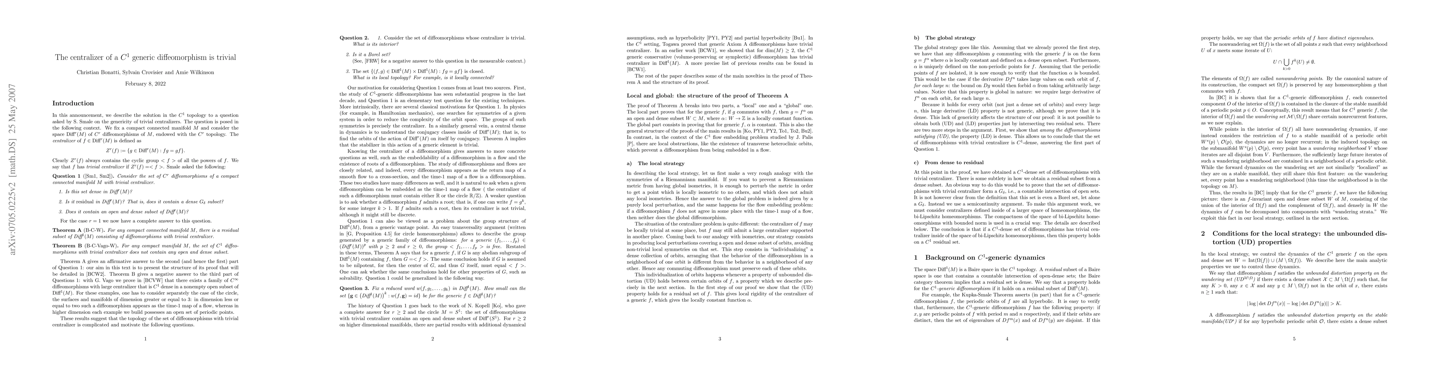 Summary: This paper resolves Smale's question about the genericity of trivial centralizers in C1 diffeomorphisms, showing that such diffeomorphisms form a residual set in Diff^1 but do not constitute an open and dense subset.