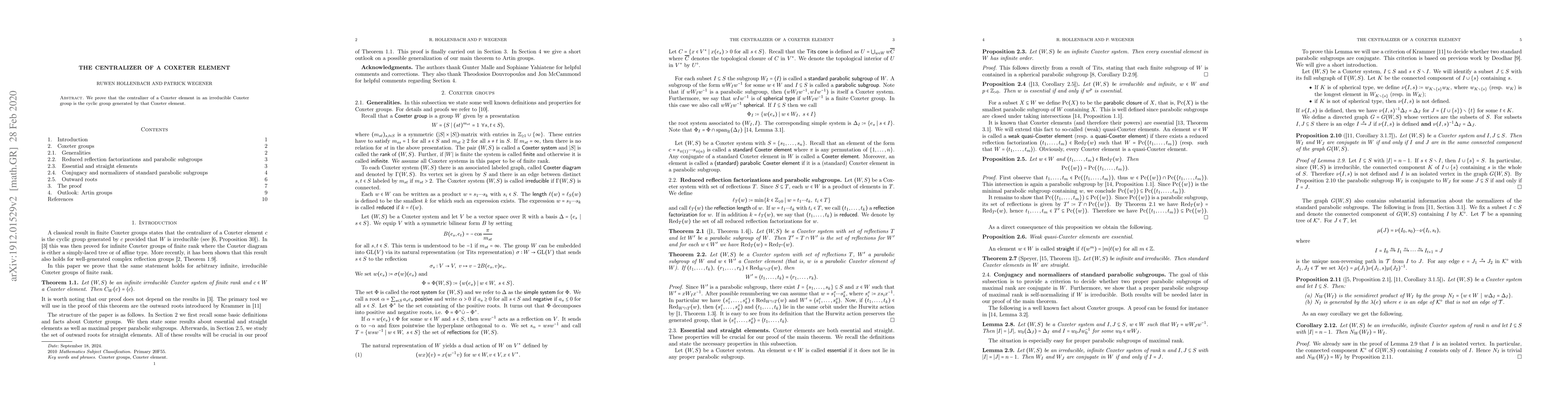 Summary: This paper demonstrates that the centralizer of a Coxeter element within an irreducible Coxeter group is a cyclic group generated by the Coxeter element itself. The result provides insight into the structure of these groups.