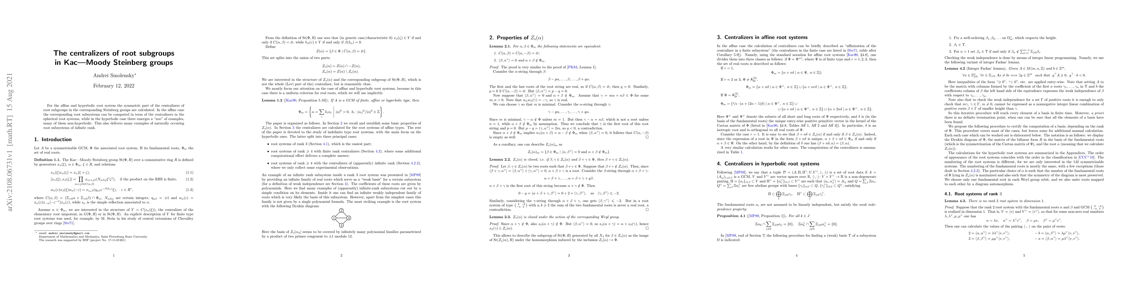 For the affine and hyperbolic root system the symmetric part of the centralizers of root subgroups in the corresponding Steinberg groups are calculated. In the affine case the corresponding root subsystems can be computed in term of the centralizers in the spherical root systems, while in the hyperbolic case there emerges a "zoo" of examples, many of them non-hyperbolic. This also delivers many examples of naturally occuring root subsystems of infinite rank.