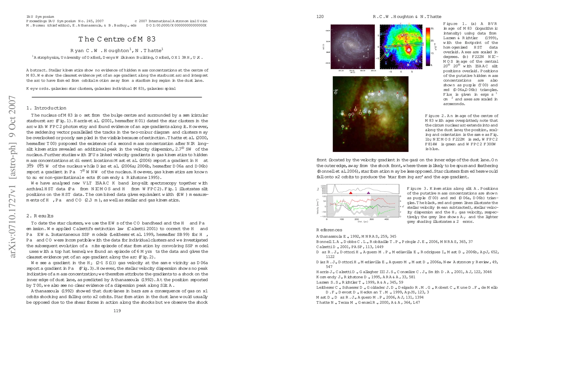 Stellar kinematics show no evidence of hidden mass concentrations at the centre of M83. We show the clearest evidence yet of an age gradient along the starburst arc and interpret the arc to have formed from orbital motion away from a starforming region in the dust lane.