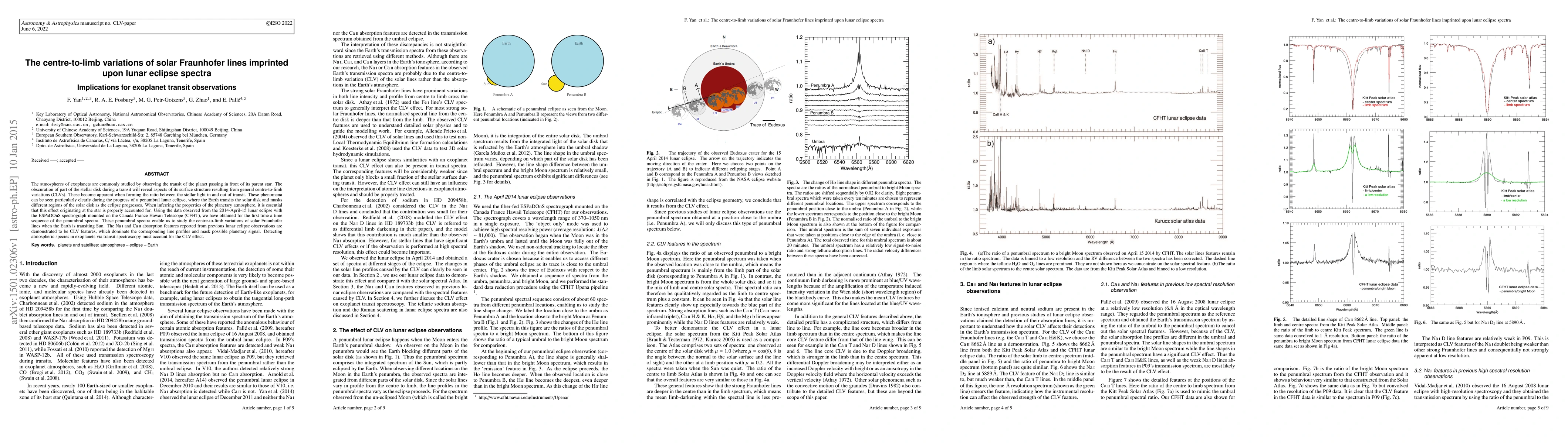The atmospheres of exoplanets are commonly studied by observing the transit of the planet passing in front of its parent star. The obscuration of part of the stellar disk during a transit will reveal aspects of its surface structure resulting from general centre-to-limb variations (CLVs). These become apparent when forming the ratio between the stellar light in and out of transit. These phenomena can be seen particularly clearly during the progress of a penumbral lunar eclipse, where the Earth transits the solar disk and masks different regions of the solar disk as the eclipse progresses. When inferring the properties of the planetary atmosphere, it is essential that this effect originating at the star is properly accounted for. Using the data observed from the 2014-April-15 lunar eclipse with the ESPaDOnS spectrograph mounted on the Canada France Hawaii Telescope (CFHT), we have obtained for the first time a time sequence of the penumbral spectra. These penumbral spectra enable us to study the centre-to-limb variations of solar Fraunhofer lines when the Earth is transiting Sun. The Na i and Ca ii absorption features reported from previous lunar eclipse observations are demonstrated to be CLV features, which dominate the corresponding line profiles and mask possible planetary signal. Detecting atmospheric species in exoplanets via transit spectroscopy must account for the CLV effect.