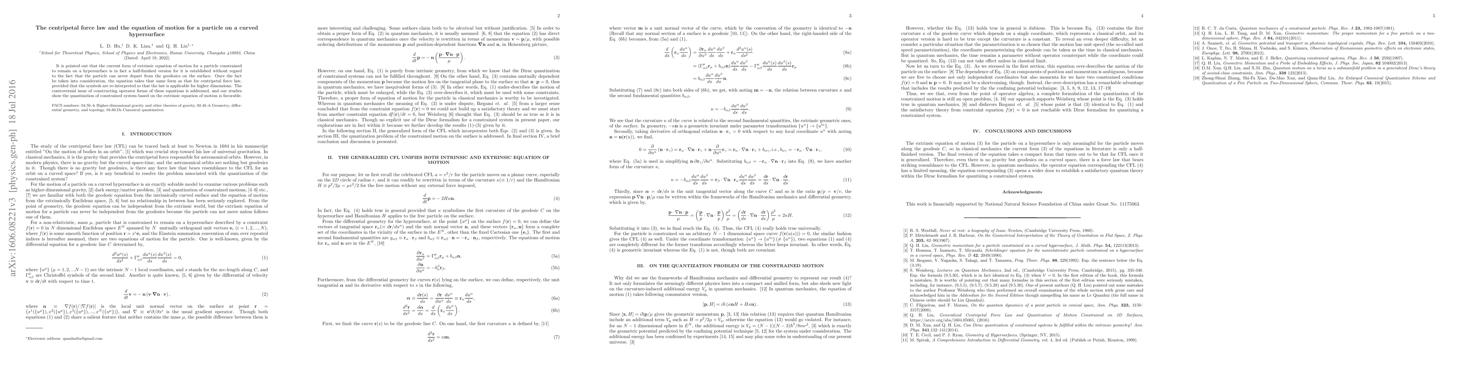 It is pointed out that the current form of extrinsic equation of motion for a particle constrained to remain on a hypersurface is in fact a half-finished version for it is established without regard to the fact that the particle can never depart from the geodesics on the surface. Once the fact be taken into consideration, the equation takes that same form as that for centripetal force law, provided that the symbols are re-interpreted so that the law is applicable for higher dimensions. The controversial issue of constructing operator forms of these equations is addressed, and our studies show the quantization of constrained system based on the extrinsic equation of motion is favorable.