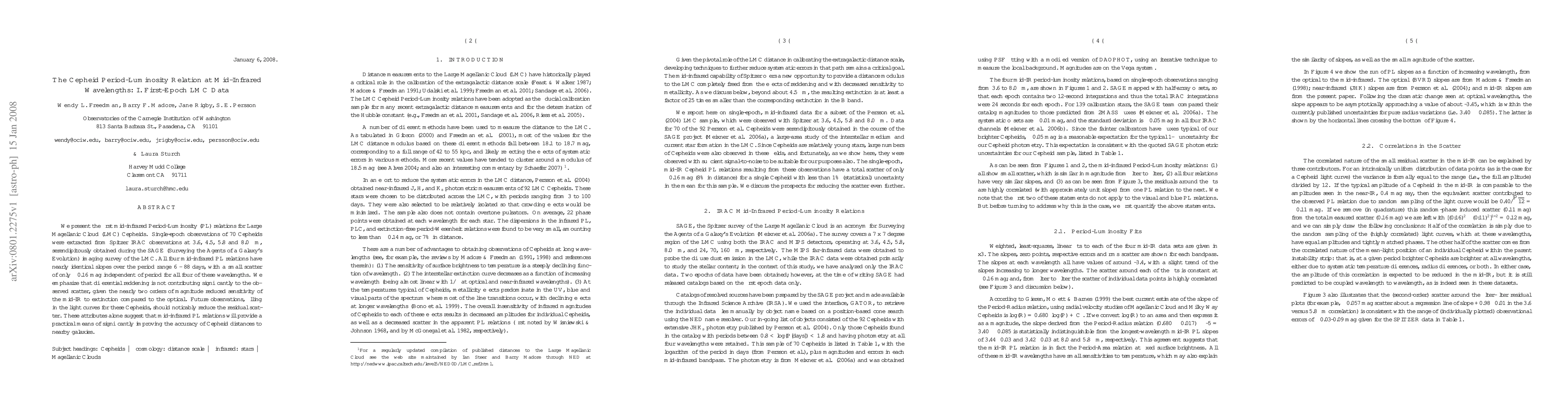 This paper presents the first mid-infrared Period-Luminosity relations for Cepheids in the Large Magellanic Cloud, derived from Spitzer IRAC observations. The study finds consistent slopes and minimal scatter across four mid-infrared wavelengths, suggesting that mid-infrared PL relations can greatly enhance the accuracy of Cepheid distance measurements.
