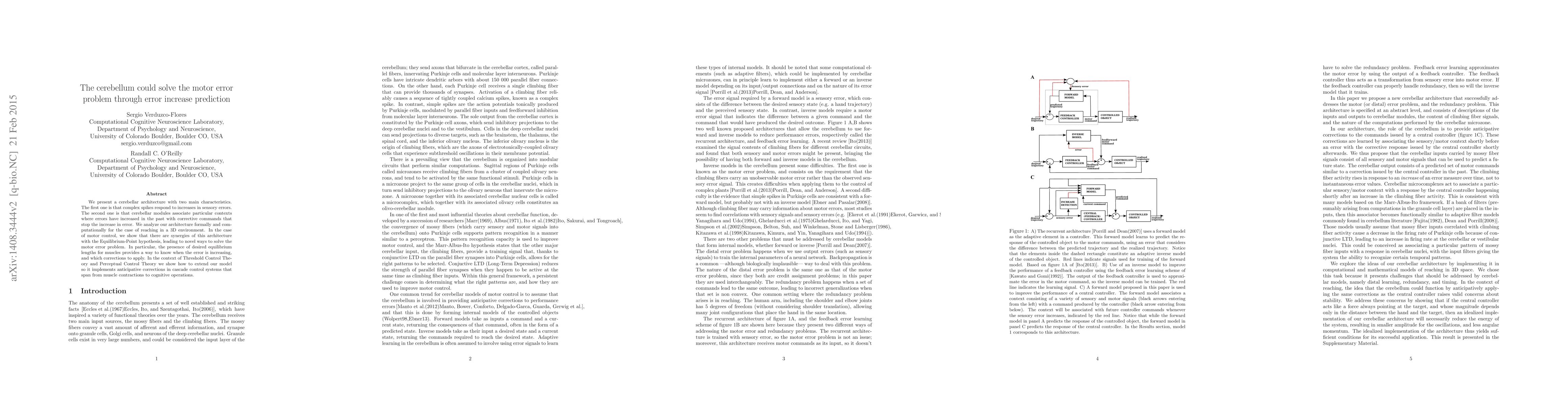 We present a cerebellar architecture with two main characteristics. The first one is that complex spikes respond to increases in sensory errors. The second one is that cerebellar modules associate particular contexts where errors have increased in the past with corrective commands that stop the increase in error. We analyze our architecture formally and computationally for the case of reaching in a 3D environment. In the case of motor control, we show that there are synergies of this architecture with the Equilibrium-Point hypothesis, leading to novel ways to solve the motor error problem. In particular, the presence of desired equilibrium lengths for muscles provides a way to know when the error is increasing, and which corrections to apply. In the context of Threshold Control Theory and Perceptual Control Theory we show how to extend our model so it implements anticipative corrections in cascade control systems that span from muscle contractions to cognitive operations.
