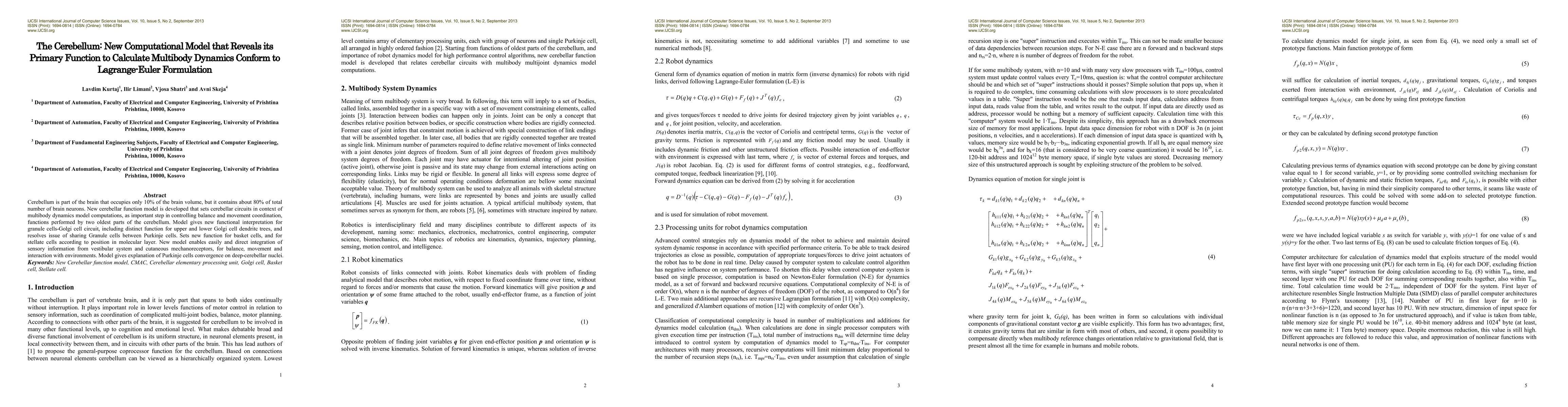 This paper introduces a new computational model of the cerebellum that interprets its primary function as calculating multibody dynamics in line with the Lagrange-Euler formulation, crucial for balance and movement coordination. The model provides new insights into cerebellar circuits and the roles of granule cells, Golgi cells, basket cells, and stellate cells, facilitating integration of sensory information for environmental interaction.