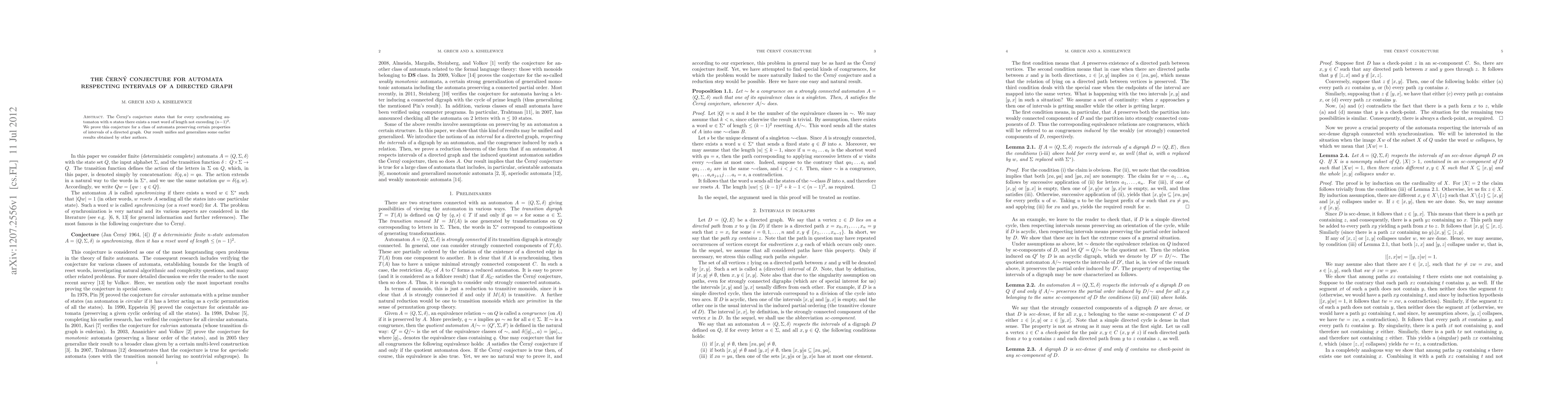 The \v{C}ern\'y's conjecture states that for every synchronizing automaton with n states there exists a reset word of length not exceeding (n-11)^2. We prove this conjecture for a class of automata preserving certain properties of intervals of a directed graph. Our result unifies and generalizes some earlier results obtained by other authors.