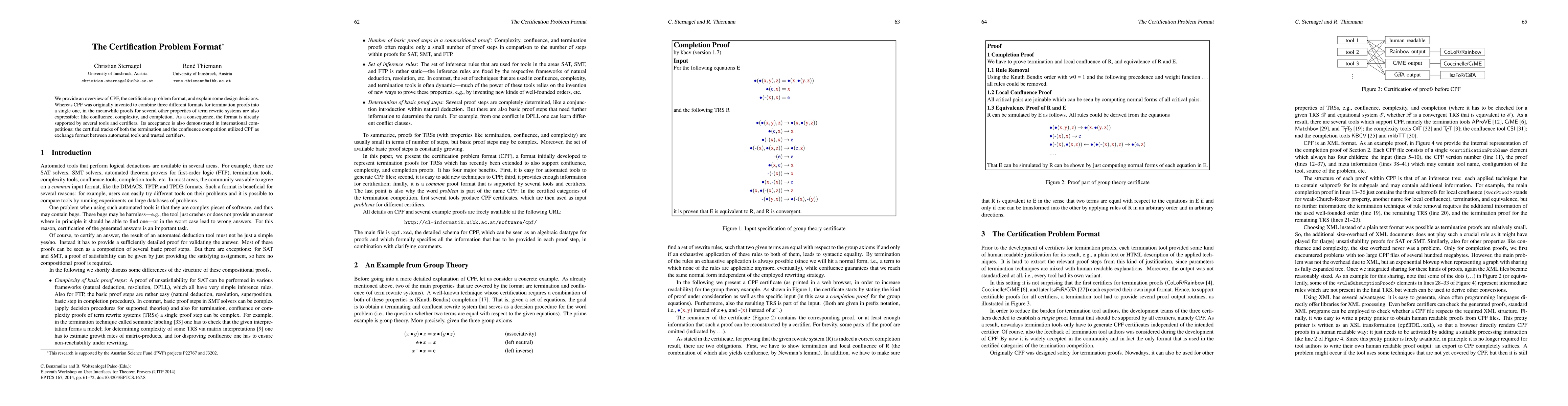 The Certification Problem Format (CPF) combines various termination proof formats into a single framework, now also supporting proofs for confluence, complexity, and completion. It is widely adopted by tools and has been used in international competitions for termination and confluence.