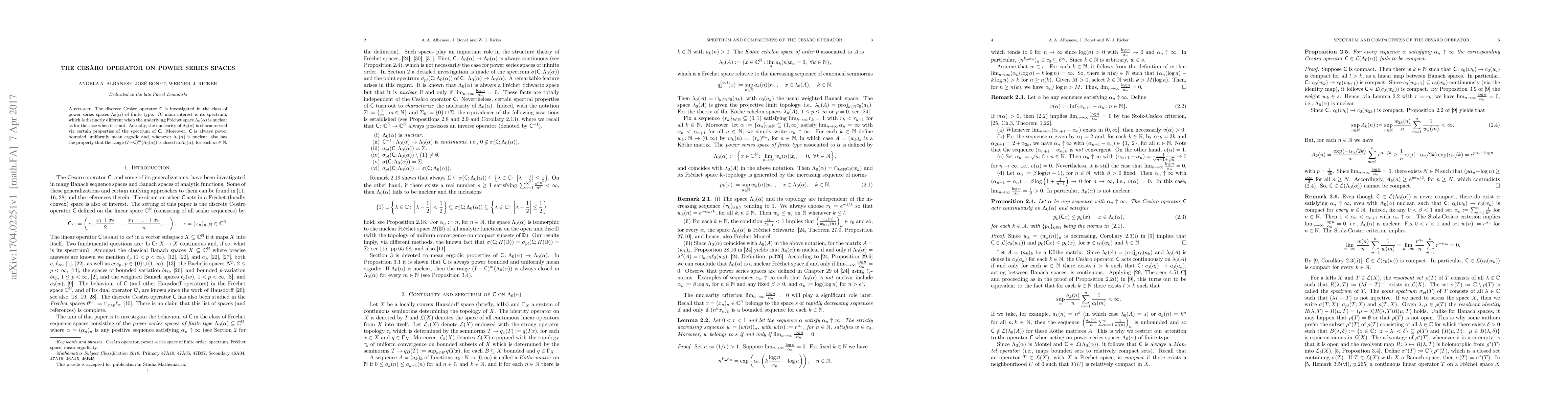 The discrete Ces\`aro operator $\mathsf{C}$ is investigated in the class of power series spaces $\Lambda_0(\alpha)$ of finite type. Of main interest is its spectrum, which is distinctly different when the underlying Fr\'echet space $\Lambda_0(\alpha)$ is nuclear as for the case when it is not. Actually, the nuclearity of $\Lambda_0(\alpha)$ is characterized via certain properties of the spectrum of $\mathsf{C}$. Moreover, $\mathsf{C}$ is always power bounded, uniformly mean ergodic and, whenever $\Lambda_0(\alpha)$ is nuclear, also has the property that the range $(I-\mathsf{C})^m(\Lambda_0(\alpha))$ is closed in $\Lambda_0(\alpha)$, for each $m\in\mathbb{N}$.