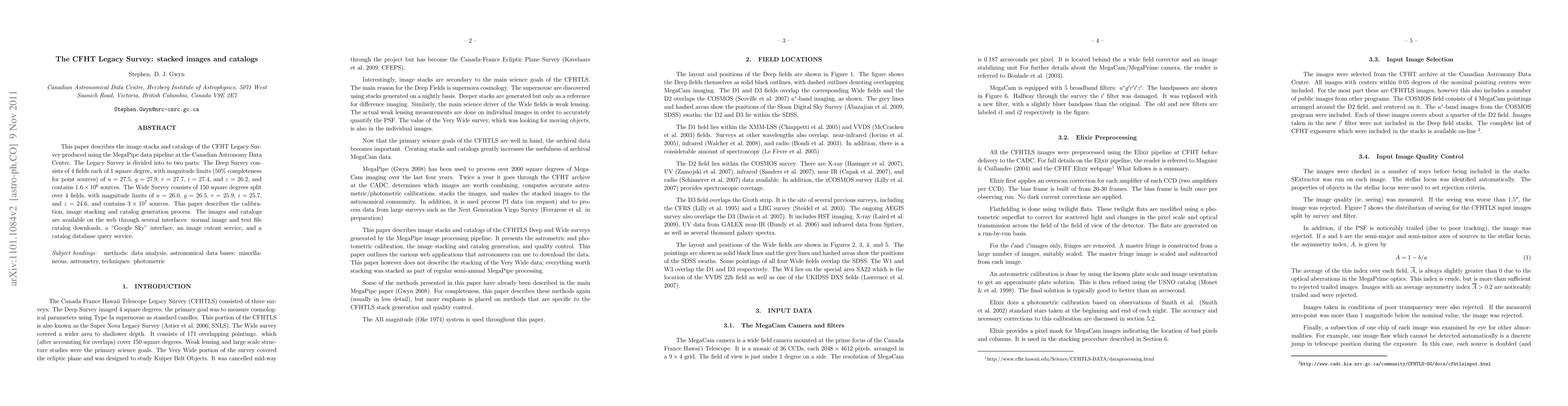 The research describes the image stacks and catalogs of the CFHT Legacy Survey produced using the MegaPipe data pipeline. It details the calibration, image stacking, and catalog generation process for both the Deep and Wide Survey fields.