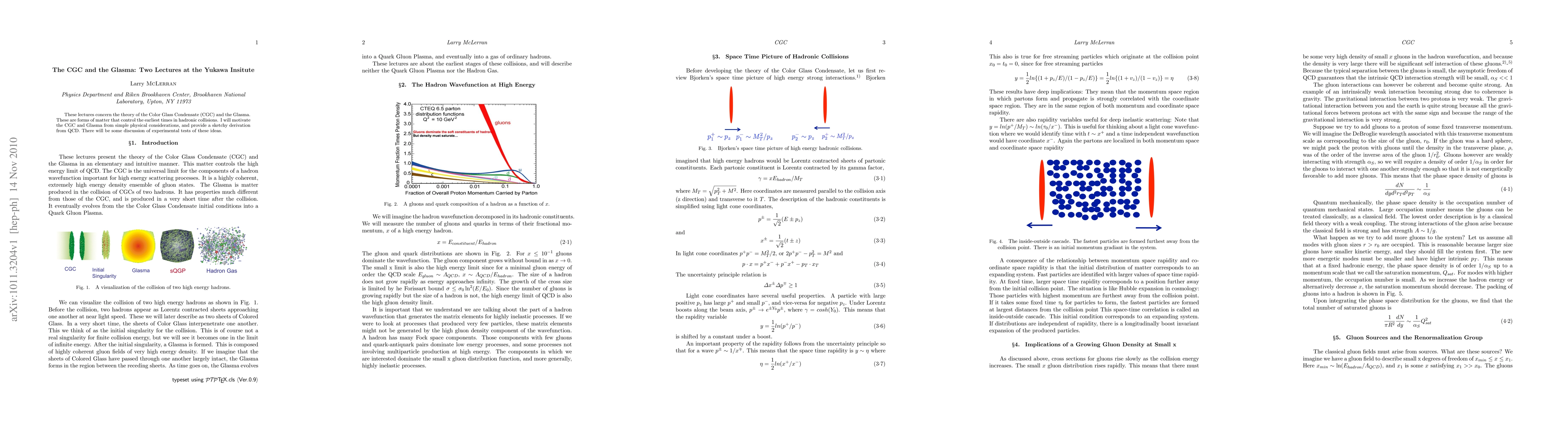 These lectures concern the theory of the Color Glass Condensate (CGC) and the Glasma. These are forms of matter that control the earliest times in hadronic collisions. I will motivate the CGC and Glasma from simple physical considerations, and provide a sketchy derivation from QCD. There will be some discussion of experimental tests of these ideas.