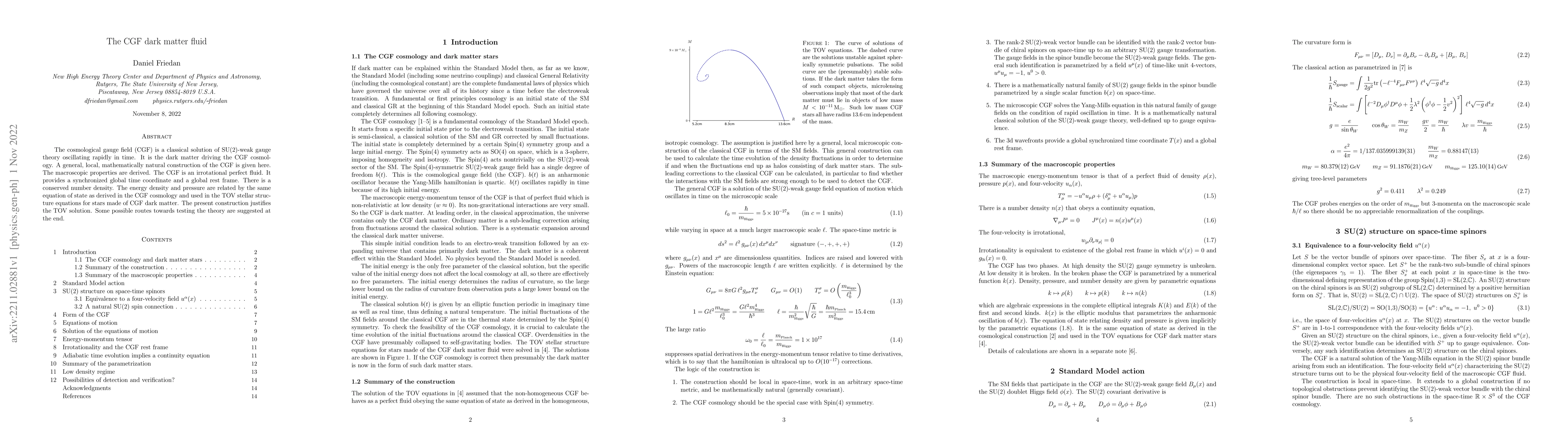 The paper presents a construction of the cosmological gauge field (CGF) as a classical solution of SU(2)-weak gauge theory, proposing it as a dark matter fluid that drives CGF cosmology. The CGF is modeled as an irrotational perfect fluid with a conserved number density and an equation of state consistent with the TOV stellar structure equations.