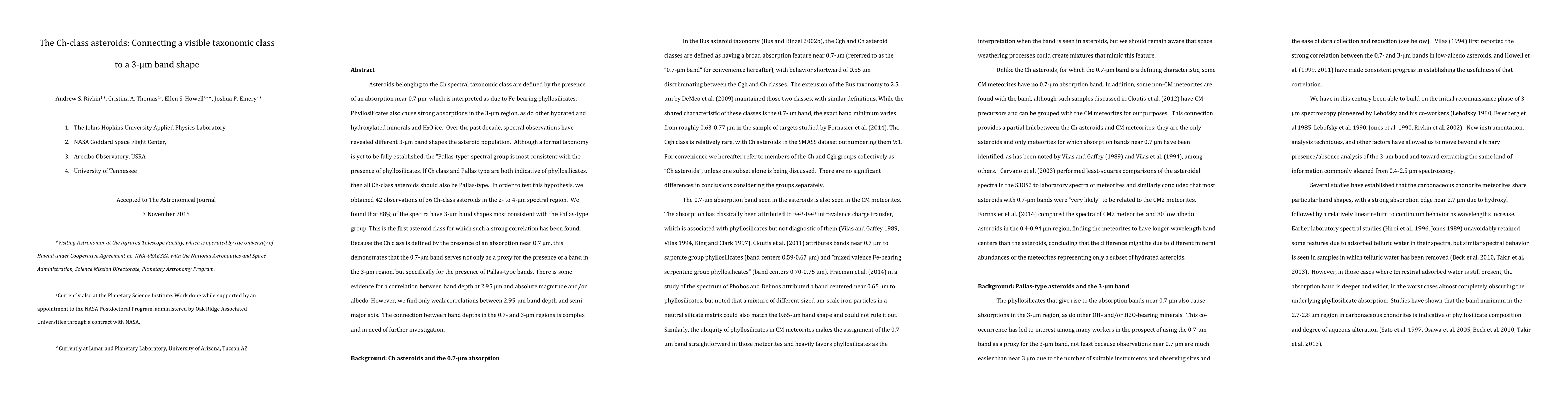 Asteroids belonging to the Ch spectral taxonomic class are defined by the presence of an absorption near 0.7 {\mu}m, which is interpreted as due to Fe-bearing phyllosilicates. Phyllosilicates also cause strong absorptions in the 3-{\mu}m region, as do other hydrated and hydroxylated minerals and H2O ice. Over the past decade, spectral observations have revealed different 3-{\mu}m band shapes the asteroid population. Although a formal taxonomy is yet to be fully established, the "Pallas-type" spectral group is most consistent with the presence of phyllosilicates. If Ch class and Pallas type are both indicative of phyllosilicates, then all Ch-class asteroids should also be Pallas-type. In order to test this hypothesis, we obtained 42 observations of 36 Ch-class asteroids in the 2- to 4-{\mu}m spectral region. We found that 88% of the spectra have 3-{\mu}m band shapes most consistent with the Pallas-type group. This is the first asteroid class for which such a strong correlation has been found. Because the Ch class is defined by the presence of an absorption near 0.7 {\mu}m, this demonstrates that the 0.7-{\mu}m band serves not only as a proxy for the presence of a band in the 3-{\mu}m region, but specifically for the presence of Pallas-type bands. There is some evidence for a correlation between band depth at 2.95 {\mu}m and absolute magnitude and/or albedo. However, we find only weak correlations between 2.95-{\mu}m band depth and semi-major axis. The connection between band depths in the 0.7- and 3-{\mu}m regions is complex and in need of further investigation.