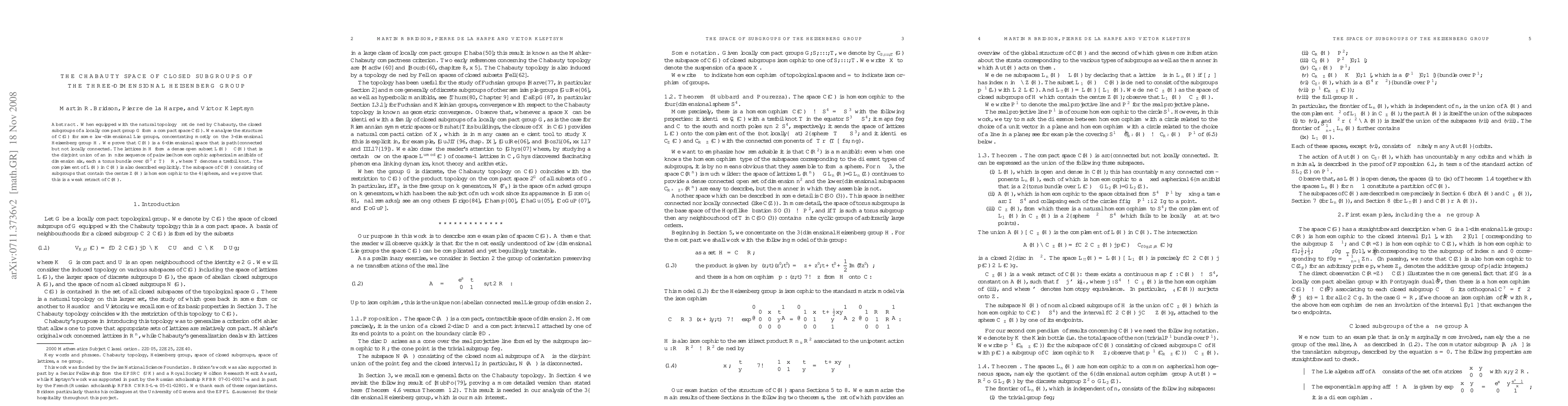 When equipped with the natural topology first defined by Chabauty, the closed subgroups of a locally compact group $G$ form a compact space $\Cal C(G)$. We analyse the structure of $\Cal C(G)$ for some low-dimensional Lie groups, concentrating mostly on the 3-dimensional Heisenberg group $H$. We prove that $\Cal C(H)$ is a 6-dimensional space that is path--connected but not locally connected. The lattices in $H$ form a dense open subset $\Cal L(H) \subset \Cal C(H)$ that is the disjoint union of an infinite sequence of pairwise--homeomorphic aspherical manifolds of dimension six, each a torus bundle over $(\bold S^3 \smallsetminus T) \times \bold R$, where $T$ denotes a trefoil knot. The complement of $\Cal L(H)$ in $\Cal C(H)$ is also described explicitly. The subspace of $\Cal C(H)$ consisting of subgroups that contain the centre $Z(H)$ is homeomorphic to the 4--sphere, and we prove that this is a weak retract of $\Cal C(H)$.