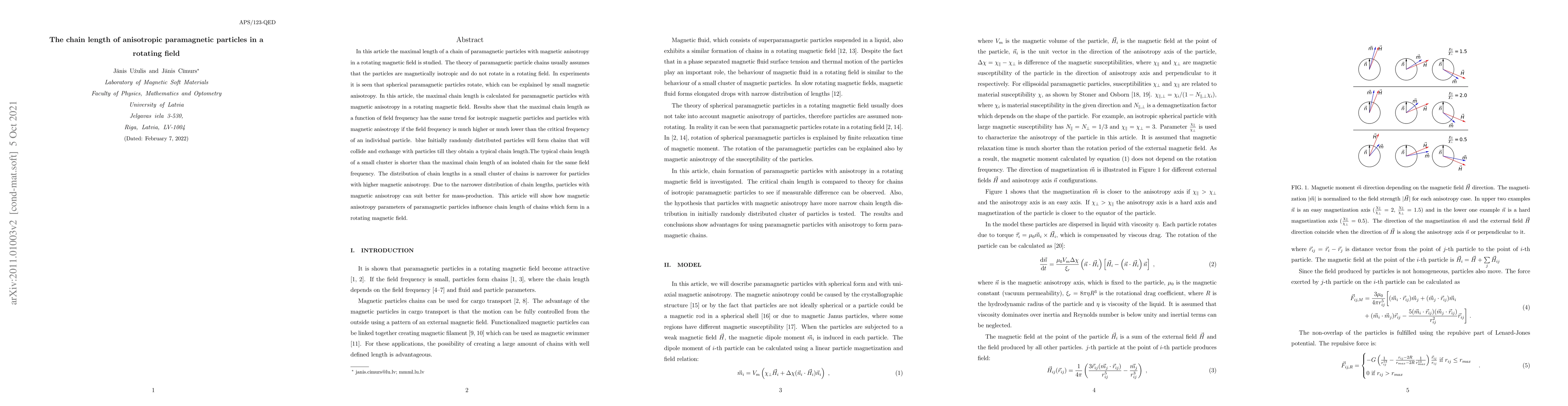 The paper presents a detailed theoretical and numerical analysis of chain length dynamics in anisotropic paramagnetic particles under rotating magnetic fields, providing insights into the influence of magnetic anisotropy parameters.