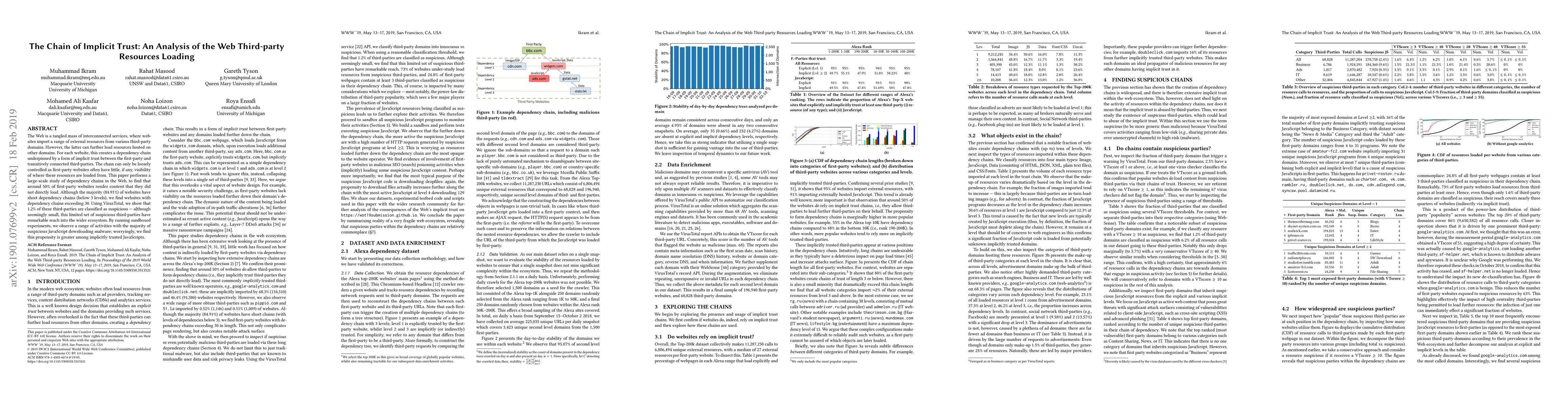 This paper investigates the implicit trust chains formed by third-party resource loading on the Web, revealing that 50% of first-party websites render content from unmonitored sources. It finds that while most chains are short, some extend over 30 levels, with 1.2% of these third-party sources being classified as suspicious, often distributing malware.