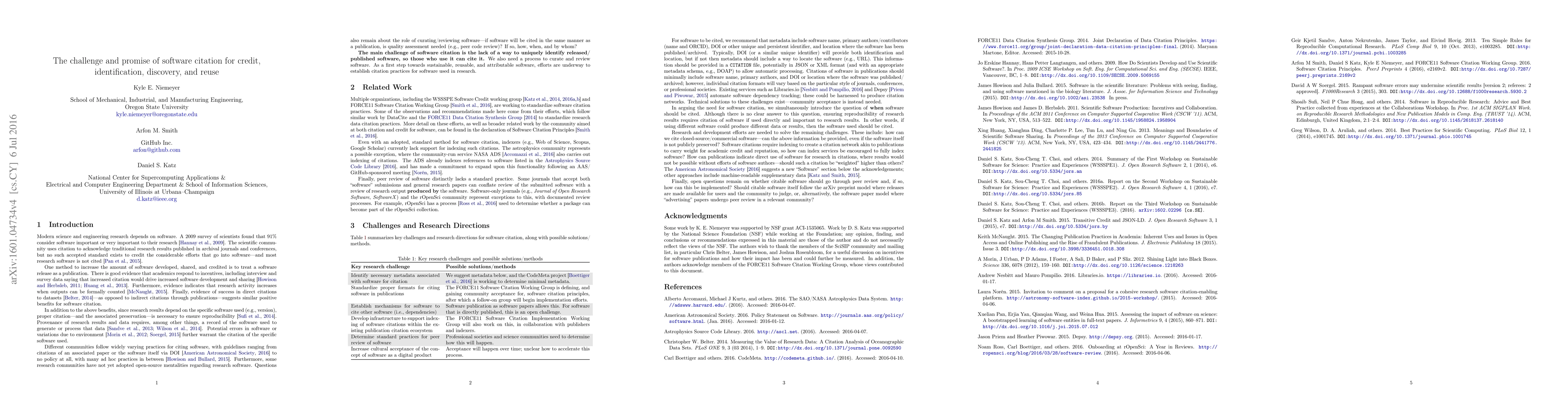 This paper explores the complexities of software citation to ensure proper credit, identification, and reuse of software in research, while also discussing necessary metadata and related research directions.